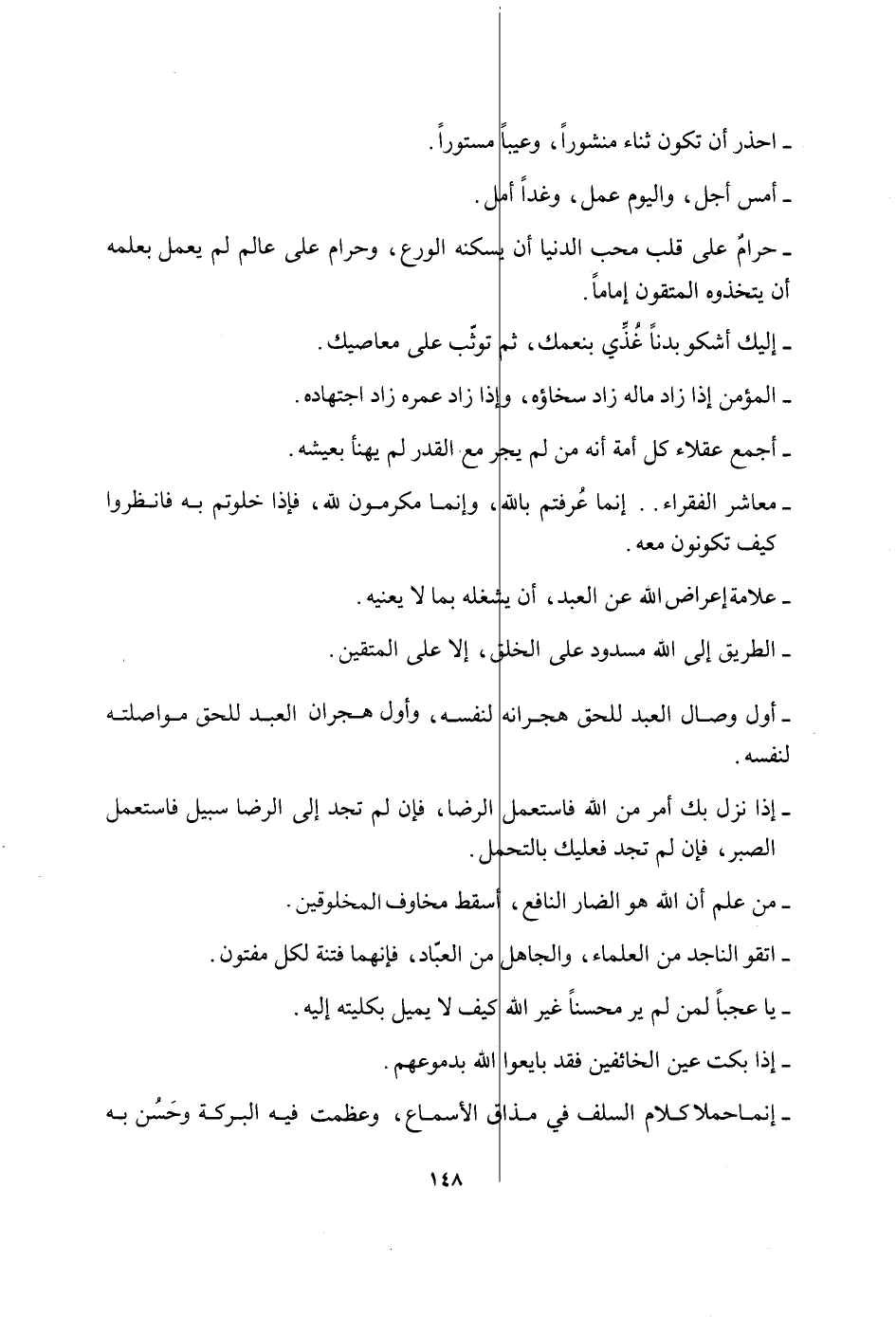 احذر أَن تكون ثَنَاء منشورا وعيبا مَسْتُورا أمس أجل وَالْيَوْم عمل وَغدا أمل حرَام على قلب محب الدُّنْيَا ان يسكنهُ الْوَرع وَحرَام على عَالم لم يعْمل بِعِلْمِهِ أَن يتخذوه المتقون إِمَامًا إِلَيْك أَشْكُو بدنا غذي بنعمك ثمَّ توثب على مَعَاصِيك الْمُؤمن إِذا زَاد سخاؤه وَإِذا زَاد عمره زَاد اجْتِهَاده اجْمَعْ عقلاء كل أمة أَنه من لم يجر مَعَ الْقدر لم يهنأ بعيشه معاشر الْفُقَرَاء إِنَّمَا عَرَفْتُمْ بِاللَّه وَإِنَّمَا مكرمون لله فَإِذا خلوتم بِهِ فانظروا كَيفَ تَكُونُونَ مَعَه عَلامَة إِعْرَاض الله عَن العَبْد أَن يشْغلهُ بِمَا لَا يعنيه الطَّرِيق إِلَى الله مسدود على الْخلق إِلَّا على الْمُتَّقِينَ أول وصال العَبْد للحق هجرانه لنَفسِهِ وَأول هجران العَبْد للحق مواصلته لنَفسِهِ إِذا نزل بك أَمر من الله فَاسْتعْمل الرِّضَا فَإِن لم تَجِد إِلَى الرِّضَا سَبِيل فَاسْتعْمل الصَّبْر فَإِن لم تَجِد فَعَلَيْك بالتحمل من علم أَن الله هُوَ الضار النافع أسقط مخاوف المخلوقين اتَّقوا الناجد من الْعلمَاء وَالْجَاهِل من الْعباد فَإِنَّهُمَا فتْنَة لكل مفتون يَا عجبا لمن لم ير محسنا غير الله كَيفَ لَا يمِيل بكليتيه إِلَيْهِ إِذا بَكت عين الْخَائِفِينَ فقد بَايعُوا الله بدموعهم إِنَّمَا حملا كَلَام السّلف فِي مذاق الأسماع وعظمت فِيهِ الْبركَة وَحسن بِهِ