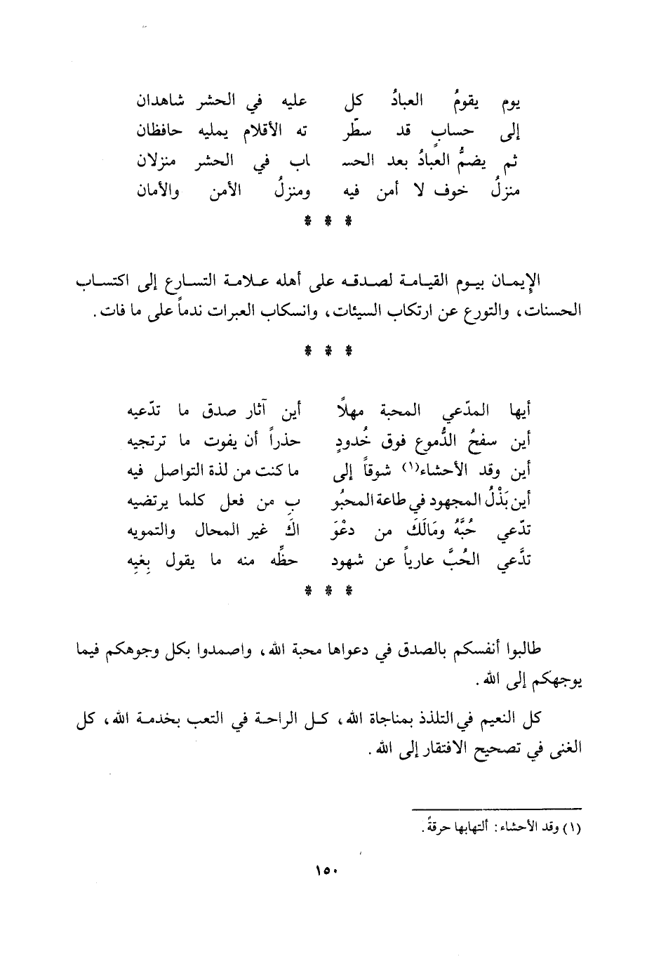 يَوْم يقوم الْعباد كل عَلَيْهِ فِي الْحَشْر شَاهِدَانِ إِلَى حِسَاب قد سطر ته الأقلام يمليه جافظان ثمَّ يضم الْعباد بعد الْحَسَد اب فِي الْحَشْر منزلان منزل خوف لَا امن فِيهِ ومنزل الْأَمْن والأمان الْإِيمَان بِيَوْم الْقِيَامَة لصدقه على أَهله عَلامَة التسارع إِلَى اكْتِسَاب الْحَسَنَات والتورع عَن ارْتِكَاب السَّيِّئَات وانسكاب العبرات ندما على مَا فَاتَ أَيهَا الْمُدَّعِي الْمحبَّة مهلا أَيْن آثَار صدق مَا تدعيه أَيْن سفح الدُّمُوع فَوق خدود حذرا ان يفوت مَا ترتجيه أَيْن وَقد الأحشاء شوقا إِلَى مَا كنت من لَذَّة التواصل فِيهِ أَيْن بذل المجهود فِي طَاعَة المجبو ب من كل فعل كلما يرتضيه تَدعِي حبه وَمَالك من دعو اك غير الْمحَال والتمويه تَدعِي الْحبّ عَارِيا عَن شُهُود حَظه مِنْهُ مَا يَقُول بغيه طالبوا أَنفسكُم بِالصّدقِ فِي دَعْوَاهَا محبَّة الله واصمدوا بِكُل وُجُوهكُم فِيمَا يوجهكم إِلَى الله كل النَّعيم فِي التَّلَذُّذ بمناجاة الله كل الرَّاحَة فِي التَّعَب بِخِدْمَة الله كل الْغنى فِي تَصْحِيح الإفتقار إِلَى الله