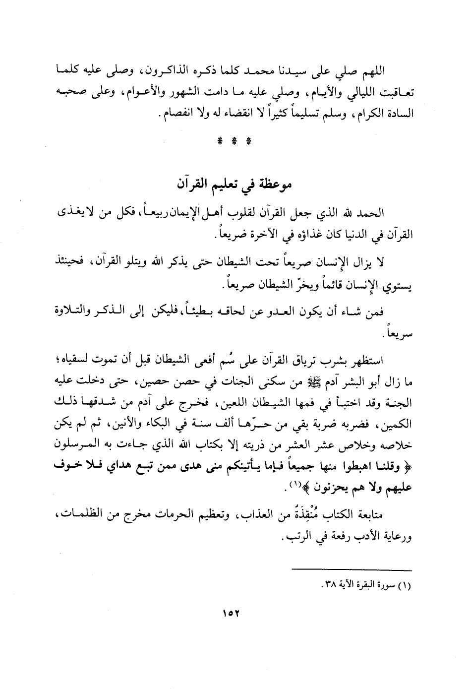 الْحَمد لله الَّذِي جعل الْقُرْآن لقلوب أهل الْإِيمَان ربيعا فَكل من لَا يغذي الْقُرْآن فِي الدُّنْيَا كَانَ غذاؤه فِي الْآخِرَة ضريعا لَا يزَال الْإِنْسَان صَرِيعًا تَحت الشَّيْطَان حَتَّى يذكر الله وَيَتْلُو الْقُرْآن فَحِينَئِذٍ يَسْتَوِي الْإِنْسَان قَائِما ويخر الشَّيْطَان صَرِيعًا فَمن شَاءَ ان يكون الْعَدو عَن لحاقه بطيئا فَلْيَكُن إِلَى الذّكر والتلاوة سَرِيعا استظهر بِشرب ترياق الْقُرْآن على سم أَفْعَى الشَّيْطَان قبل أَن تَمُوت لسقياه مَا زَالَ أَبُو الْبشر آدم صلى الله عَلَيْهِ وَسلم من سُكْنى الجنات قي حصن حُصَيْن حَتَّى دخلت عَلَيْهِ الْجنَّة وَقد اخْتَبَأَ فِي فمها الشَّيْطَان اللعين فَخرج على آدم من شدقها ذَلِك الكمين فَضَربهُ ضَرْبَة بَقِي من حرهَا ألف سنة فِي الْبكاء والأنين ثمَّ لم يكن خلاصه وخلاص عشر الْعشْر من ذُريَّته إِلَّا بِكِتَاب الله الَّذِي جَاءَت بِهِ المرسلونوقلنا اهبطوا مِنْهَا جَمِيعًا فإمَّا يَأْتينكُمْ منى هدى مِمَّن تبع هُدَايَ فَلَا خوف عَلَيْهِم وَلَا هم يَحْزَنُونَ مُتَابعَة الْكتاب منقذة من الْعَذَاب وتعظيم الحرمات مخرج من الظُّلُمَات ورعاية الْأَدَب رفْعَة فِي الرتب