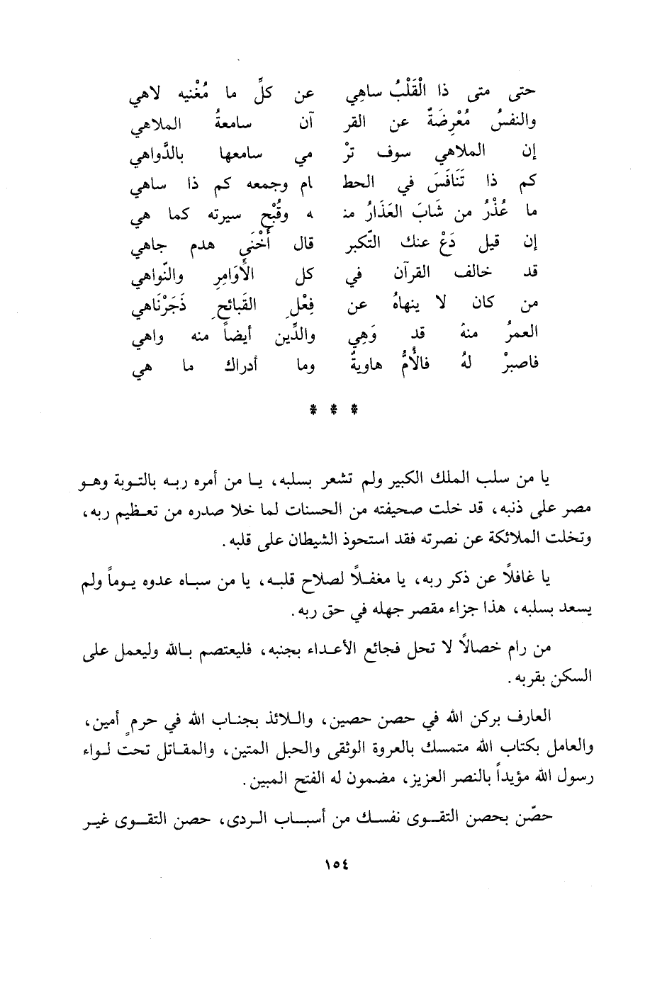 حَتَّى مَتى ذَا الْقلب ساهي عَن كل مَا مغنيه لاهي وَالنَّفس معرضة عَن القر آن سامعة الملاهي إِن الملاهي سَوف تَرَ مي سامعها بالدواهي كم ذَا تنافس فِي الْحَط ام وَجمعه كم ذَا ساهي مَا عذر من شَاب العذار مِنْهُ وقبح سيرته كَمَا هِيَ إِن قيل دع عَنْك التكبر قَالَ أخني هدم جاهي قد خَالف الْقُرْآن فِي كل الْأَوَامِر والنواهي من كَانَ لَا ينهاه عَن فعل القبائح ذجرناهي الْعُمر مِنْهُ قد وَهِي وَالدّين أَيْضا مِنْهُ واهي فاصبر لَهُ فالأم هاوية وَمَا أَدْرَاك مَا هِيَ يَا من سلب الْملك الْكَبِير وَلم تشعر بسلبه يَا من أمره ربه بِالتَّوْبَةِ وَهُوَ مصر على ذَنبه قد خلت صَحِيفَته من الْحَسَنَات لما خلا صَدره من تَعْظِيم ربه وتخلت الْمَلَائِكَة عَن نصرته فقد استحوذ الشَّيْطَان على قلبه يَا غافلا عَن ذكر ربه يَا مغفلا لصلاح قلبه يَا من سباه عدوه يَوْمًا وَلم يسْعد بسلبه هَذَا جَزَاء مقصر جَهله فِي حق ربه من رام خِصَالًا لَا تحل فجائع الْأَعْدَاء بجنبه فليعتصم بِاللَّه وليعمل على السكن بِقُرْبِهِ الْعَارِف بِرُكْن الله فِي حصن حُصَيْن واللائذ بجناب الله فِي حرم أَمِين وَالْعَامِل بِكِتَاب الله متمسك بالعروة الوثقى وَالْحَبل المتين والمقاتل تَحت لِوَاء رَسُول الله مؤيدا بالنصر الْعَزِيز مَضْمُون لَهُ الْفَتْح الْمُبين حصن بحصن التَّقْوَى نَفسك من أَسبَاب الردى حصن التَّقْوَى غير
