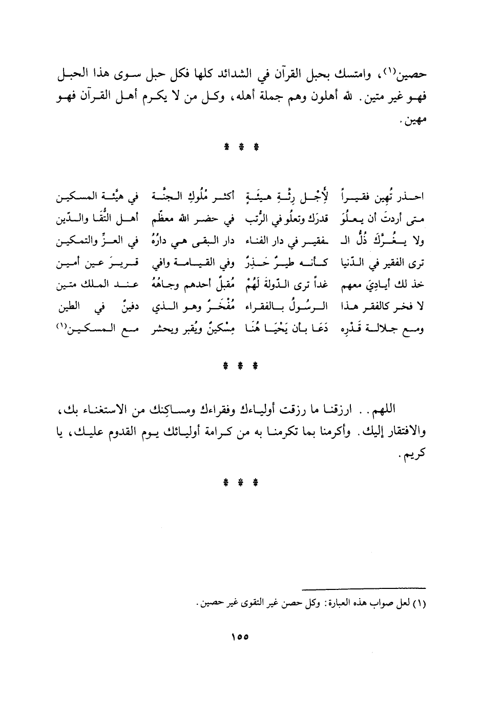 حُصَيْن وامتسك بِحَبل الْقُرْآن فِي الشدائد كلهَا فَكل حَبل سوى هَذَا الْحَبل فَهُوَ غير متين لله أهلون وهم جملَة أَهله وكل من لَا يكرم أهل الْقُرْآن فَهُوَ مهين احذر تهين فَقِيرا لأجل رثه هَيْئَة أَكثر مُلُوك الْجنَّة فِي هَيْئَة الْمِسْكِين مَتى أردْت أَن يَعْلُو قدرك وَتَعْلُو فِي الرتب فِي حضر الله مُعظم أهل التقا وَالدّين وَلَا يغرك ذل الْفَقِير فِي دَار الفناء دَار البقى هِيَ دَاره فِي الْعِزّ والتمكين ترى الْفَقِير فِي الدُّنْيَا كَأَنَّهُ طير حذر وَفِي الْقِيَامَة وافي قرير عين أَمِين خُذ لَك أيادي مَعَهم غَدا ترى الدولة لَهُم مقبل أحدهم وجاهه عِنْد الْملك متين لَا فَخر كالفقر هَذَا الرَّسُول بالفقراء مفخر وَهُوَ الَّذِي دَفِين فِي الطين وَمَعَ جلالة قدره دَعَا بِأَن يحيا هُنَا مِسْكين ويقبر ويحشر مَعَ الْمِسْكِين اللَّهُمَّ ارزقنا مَا رزقت أولياءك وفقراءك ومساكنك من الِاسْتِغْنَاء بك والافتقار إِلَيْك وَأَكْرمنَا بِمَا تكرمنا بِهِ من كَرَامَة أوليائك يَوْم الْقدوم عَلَيْك يَا كريم