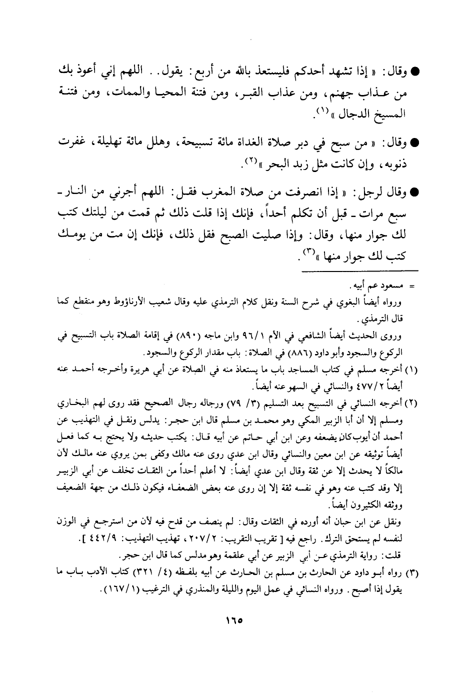 وَقَالَ إِذا تشهد أحدكُم فليستعذ بِاللَّه من أَربع يَقُول اللَّهُمَّ إِنِّي أعوذ بك من عَذَاب جَهَنَّم وَمن عَذَاب الْقَبْر وَمن فتْنَة الْمحيا وَالْمَمَات وَمن فتْنَة الْمَسِيح الدَّجَّال وَقَالَ من سبح فِي دبر كل صَلَاة الْغَدَاة مائَة تَسْبِيحَة وَهَلل مائَة تَهْلِيلَة غفرت ذنُوبه وَإِن كَانَت مثل زبد الْبَحْر وَقَالَ لرجل إِذا انصرفت من صَلَاة الْمغرب فَقل اللَّهُمَّ أجرني من النَّار سبع مَرَّات قبل ان تكلم احدا فَإنَّك إِذا قلت ذَلِك قُمْت من ليلتك كتب لَك جوَار مِنْهَا وَقَالَ وَإِذا صليت الصُّبْح فَقل ذَلِك فَإنَّك إِن مت من يَوْمك كتب لَك جوَار مِنْهَا