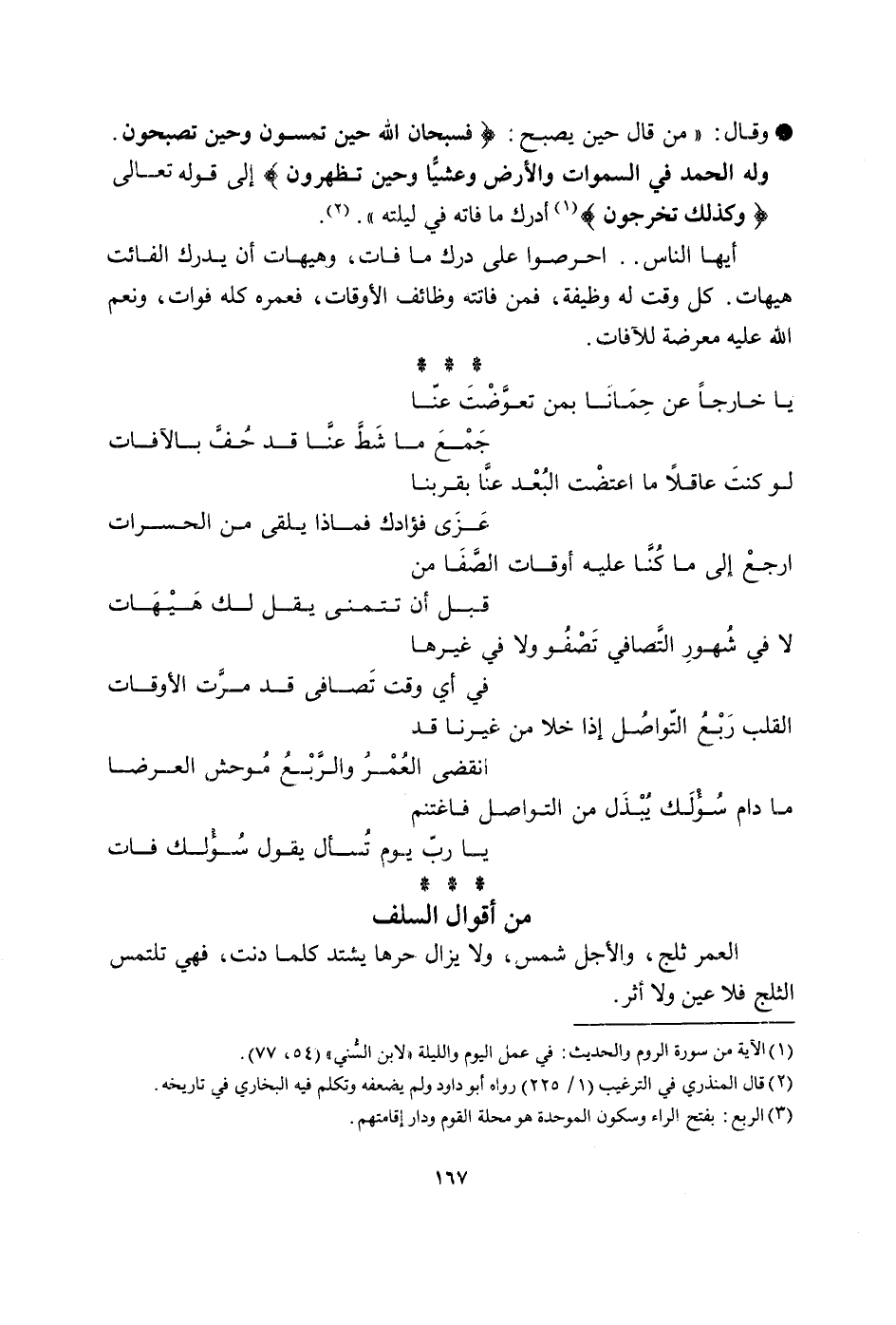 وَقَالَ من قَالَ حِين يصبح فسبحان الله حِين تمسون وَحين تُصبحُونَ وَله الْحَمد فِي السَّمَوَات وَالْأَرْض وعشيا وَحين تظْهرُونَ إِلَى قَوْله تَعَالَى وَكَذَلِكَ تخرجُونَ أدْرك مَا فَاتَهُ فِي ليلته أَيهَا النَّاس احرصوا على دَرك مَا فَاتَ وهيهات أَن يدْرك الْفَائِت هَيْهَات كل وَقت لَهُ وَظِيفَة فَمن فَاتَتْهُ وظائف الْأَوْقَات فعمره كُله فَوَات وَنعم الله عَلَيْهِ معرضة للآفات ياخارجا عَن حمانا بِمن تعوضت عَنَّا جمع مَا شط عَنَّا قد حف بالآفات لَو كنت عَاقِلا مَا اعتضت الْبعد عَنَّا بقربنا عزى فُؤَادك فَمَاذَا يلقى من الحسرات ارْجع إِلَى مَا كُنَّا عَلَيْهِ أَوْقَات الصَّفَا من قبل أَن تتمنى يقل لَك هَيْهَات لَا فِي شهور التصافي تصفو وَلَا فِي غَيرهَا فِي أَي وَقت تصافى قد مرت الْأَوْقَات الْقلب ربع التواصل إِذا خلا من غَيرنَا قد انْقَضى الْعُمر وَالرّبع موحش العرضا مَا دَامَ سؤلك يبْذل من التواصل فاغتنم يَا رب يَوْم تسْأَل يَقُول سؤلك فَاتَ من أَقْوَال السّلف الْعُمر ثلج وَالْأَجَل شمس وَلَا يزَال حرهَا يشْتَد كلما دنت فَهِيَ تلتمس الثَّلج فَلَا عين وَلَا أثر