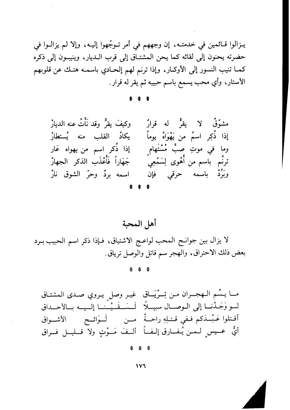 لَا يزَال بَين جوانح الْمُحب لواعج الاشتياق فَإِذا ذكر اسْم الحبيب برد بعض ذَلِك الإحتراق والهجر سم قَاتل والوصل ترياق مَا يسم الهجران من ترياق غير وصل يرْوى صدى المشتاق لَو وجدنَا إِلَى الْوِصَال سَبِيلا لسقينا إِلَيْهِ بالأحداق اقْتُلُوا عبدكم فَفِي قَتله رَاحَة من لوائح الأشواق أَي عيس لمن يُفَارق إلفا ألف موت وَلَا قَلِيل فِرَاق