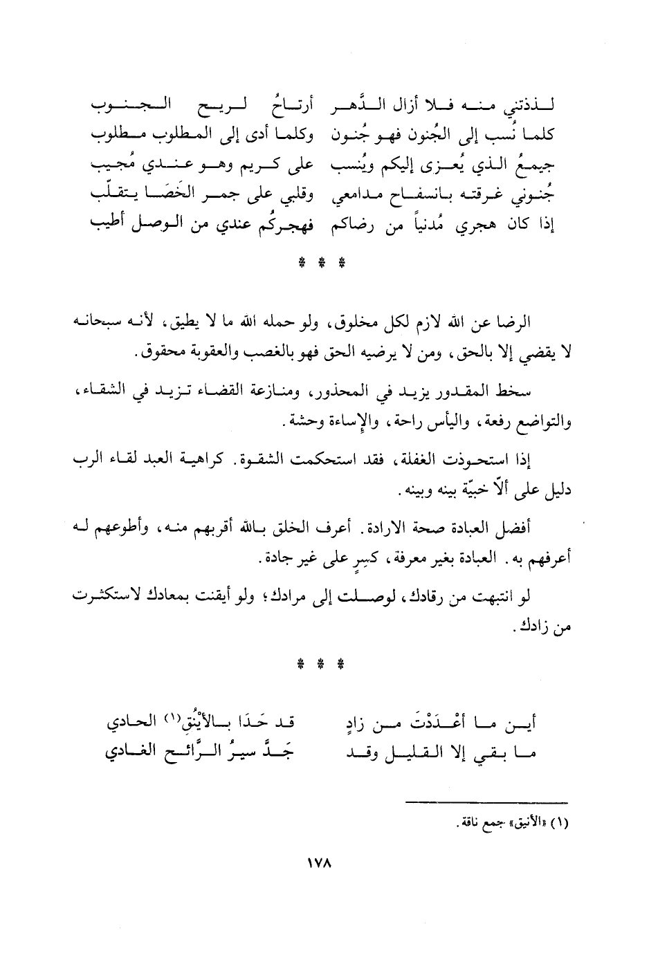 مِنْهُ فَلَا أَزَال الدَّهْر أرتاح لريح الْجنُوب كلما نسب إِلَى الْجُنُون فَهُوَ جُنُون وَكلما إدى إِلَى الْمَطْلُوب مَطْلُوب جَمِيع الَّذِي يعزى إِلَيْكُم وينسب على كريم وَهُوَ عِنْدِي مُجيب جنوني غرقته بانسفاح مدامعي وقلبي على جمر الخصا يتقلب إِذا كَانَ هجري مدنيا من رضاكم فهجركم عِنْدِي من الْوَصْل أطيب الرِّضَا عَن الله لَازم لكل مَخْلُوق وَلَو حمله الله مَا لَا يُطيق لِأَنَّهُ سُبْحَانَهُ لَا يقْضِي إِلَّا بِالْحَقِّ وَمن لَا يرضيه الْحق فَهُوَ بِالْغَصْبِ والعقوبة محقوق سخط الْمَقْدُور يزِيد فِي الْمَحْذُور ومنازعة الْقَضَاء تزيد فِي الشَّقَاء والتواضع رفْعَة واليأس رَاحَة والإساءة وَحْشَة إِذا استحوذت الْغَفْلَة فقد استحكمت الشقوة كَرَاهِيَة العَبْد لِقَاء الرب دَلِيل على أَلا خبية بَينه وَبَينه أفضل الْعباد صِحَة الْإِرَادَة أعرف الْخلق بِاللَّه أقربهم مِنْهُ وأطوعهم لَهُ أعرفهم بِهِ الْعِبَادَة بِغَيْر الْمعرفَة كسر على غير جادة لَو انْتَبَهت من رقادك لوصلت إِلَى مرادك وَلَو أيقنت بمعادك لاستكثرت من زادك أَيْن مَا أَعدَدْت من زَاد قد حدا بالأنيق الْحَادِي مَا بَقِي إِلَّا الْقَلِيل وَقد جد سير الرائد الغادي