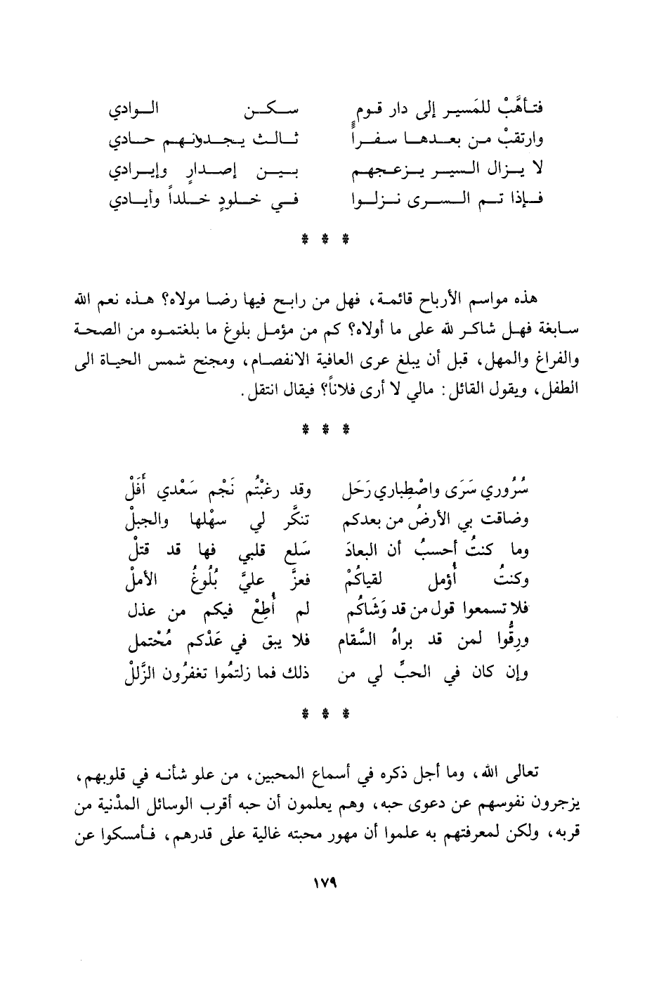 فتأهب للمسير إِلَى دَار قوم سكن الْوَادي وارتقب من بعْدهَا سفرا ثَالِث يجدونهم حادي لَا يزَال السّير يزعجهم بَين إصدار وإيرادي فَإِذا تمّ السرى نزلُوا فِي خُلُود خلدا وأيادي هَذِه مواسم الأرباح قَائِمَة فَهَل من رابح فِيهَا رضَا مَوْلَاهُ هَذِه نعم الله سابغة فَهَل شَاكر لله على مَا أولاه كم من مُؤَمل بُلُوغ مَا بلغتموه من الصِّحَّة والفراغ والمهل قبل أَن يبلغ عرى الْعَافِيَة الانفصام ومجنح شمس الْحَيَاة إِلَى الطِّفْل وَيَقُول الْقَائِل مَالِي لَا أرى فلَانا فَيُقَال انْتقل سروري سرى واصطباري رَحل وَقد رغبتم نجم سعدي أفل وَضَاقَتْ بِي الأَرْض من بعدكم تنكر لي سهلها والجبل وَمَا كنت أَحسب أَن البعاد سلع قلبِي فها قد قتل وَكنت أُؤَمِّل لقياكم فعز عَليّ بُلُوغ الأمل فَلَا تسمعوا قَول من قد وشاكم لم أطع فِيكُم من عذل ورقوا لمن قد براه السقام فَلَا يبْق فِي عدكم مُحْتَمل وَإِن كَانَ فِي الْحبّ لي من ذَلِك فَمَا زلتموا تغفرون الزلل تَعَالَى الله وَمَا أجل ذكره فِي أسماع المحبين من علو شَأْنه فِي قُلُوبهم يزجرون نُفُوسهم عَن دَعْوَى حبه وهم يعلمُونَ أَن حبه وهم يعلمُونَ أَن حبه أقرب الْوَسَائِل المدنية من قربه وَلَكِن لمعرفتهم بِهِ علمُوا أَن مُهُور محبته غَالِيَة على قدرهم فأمسكوا عَن