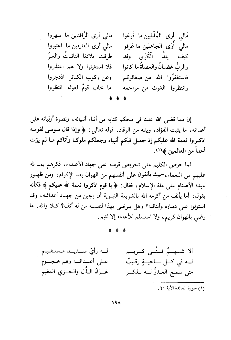 مَالِي أرى المذنبين مَا فرغوا مَالِي أرى الراقدين مَا سهروا مَالِي أرى الْجَاهِلين مَا عرفُوا مَالِي أرى العارفين مَا اعتبروا كَيفَ يلذ الْكرَى وَقد طرقت بِلَادنَا النائبات والعبر والرب غَضْبَان والعصاة مَا كَانُوا فَلَا استغيثوا وَلَا هم اعتذروا فاستغفروا الله من صغائركم وَعَن ركُوب الْكَبَائِر اذدجروا وَانْتَظرُوا الْغَوْث من مراحمه مَا خَابَ قوم لغوثه انتظروا إِن مِمَّا قضى الله علينا فِي مُحكم كِتَابه من أنباء أنبيائه وَنَصره أوليائه على أعدائه مَا يثبت الْفُؤَاد وينبه من الرقاد قَوْله تَعَالَى وَإِذا قَالَ مُوسَى لِقَوْمِهِ اذْكروا نعْمَة الله عَلَيْكُم إِذْ جعل فِيكُم أَنْبيَاء وجعلكم ملوكا وآتاكم مَا لم يُؤْت أحدا من الْعَالمين لما حرص الكليم على تحريض قومه على جِهَاد الْأَعْدَاء ذكرهم بِمَا لله عَلَيْهِم من النعماء حَيْثُ يأنفون على أنفسهم من الهوان بعد الْإِكْرَام وَمن ظُهُور عَبدة الْأَصْنَام على مِلَّة الْإِسْلَام فَقَالَ يَا قوم اذْكروا نعْمَة الله عَلَيْكُم فَكَأَنَّهُ يَقُول أما يأنف من أكْرمه الله بالشريعة النَّبَوِيَّة أَن يجبن من جِهَاد أعدائه وَقد استولوا على دياره وأبنائه وَهل يرضى بِهَذَا لنَفسِهِ من لَهُ أنف كلا وَالله مَا رَضِي بالهوان كريم وَلَا استسلم للأعداء لئيم أَلا شهم فَتى كريم لَهُ رَأْي سديد مُسْتَقِيم لَهُ فِي كل نَاحيَة رَقِيب على أعدائه وهم هجوم مَتى سمع الْعَدو لَهُ بِذكر عراه الذل والخزي الْمُقِيم