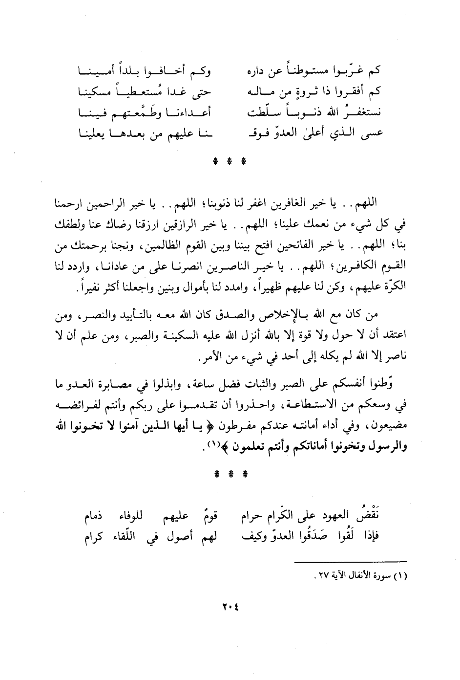 كم غربوا مستوطنا عَن دَاره وَكم أخافوا بَلَدا أَمينا كم أفقروا ذَا ثروة من مَاله حَتَّى غَدا مستعطيا مِسْكينا نَسْتَغْفِر الله ذنوبا سلطت أعداءنا وطمعتهم فِينَا عَسى الَّذِي أَعلَى الْعَدو فَوْقنَا عَلَيْهِم من بعْدهَا يعلينا اللَّهُمَّ يَا خير الغافرين اغْفِر لنا ذنوبنا اللَّهُمَّ يَا خير الرَّاحِمِينَ ارحمنا فِي كل شَيْء من نعمك علينا اللَّهُمَّ يَا خير الرازقين ارزقنا رضاك عَنَّا ولطفك بِنَا اللَّهُمَّ يَا خير الفاتحين افْتَحْ بَيْننَا وَبَين الْقَوْم الظَّالِمين ونجنا بِرَحْمَتك من الْقَوْم الْكَافرين اللَّهُمَّ يَا خير الناصرين انصرنا على من عَادَانَا واردد لنا الكرة عَلَيْهِم وَكن لنا عَلَيْهِم ظهيرا وامدد لنا بأموال وبنين واجعلنا أَكثر نفيرا من كَانَ مَعَ الله بالإخلاص والصدق كَانَ الله مَعَه بالتأييد والنصر وَمن اعْتقد أَن لَا حول وَلَا قُوَّة إِلَّا بِاللَّه أنزل الله عَلَيْهِ السكينَة وَالصَّبْر وَمن علم ان لَا نَاصِر إِلَّا الله لم يكله إِلَى اُحْدُ فِي شَيْء من الْأَمر وطنوا أَنفسكُم على الصَّبْر والثبات فضل سَاعَة وابذلوا فِي مصابرة الْعَدو مَا فِي وسعكم من الِاسْتِطَاعَة واحذروا ان تقدمُوا على ربكُم وَأَنْتُم لفرائضه مضيعون وَفِي أَدَاء أَمَانَته عنْدكُمْ مفرطونيا أَيهَا الَّذين آمنُوا لَا تخونوا الله وَالرَّسُول وتخونوا اماناتكم وَأَنْتُم تعلمُونَ نقض العهود على الْكِرَام حرَام قوم عَلَيْهِم للوفاء ذمام فَإِذا لقوا صدقُوا الْعَدو وَكَيف لَهُم أصُول فِي اللِّقَاء كرام