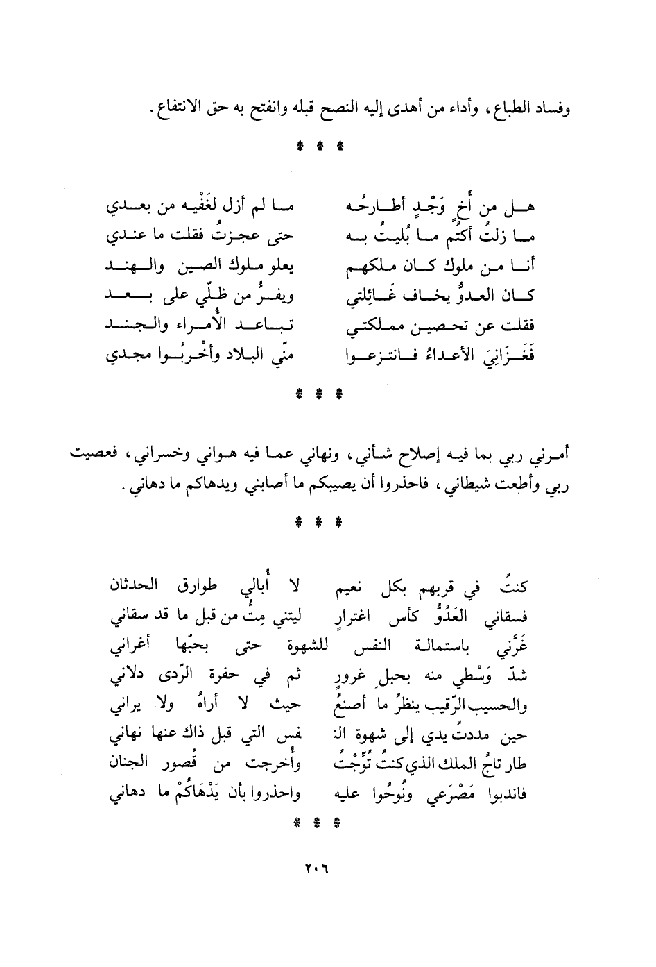 وَفَسَاد الطباع وَأَدَاء من أهْدى إِلَيْهِ النصح قبله وَانْفَتح بِهِ حق الِانْتِفَاع هَل من أَخ وجد أطارحه مَا لم أزل لغفيه من بعدِي مَا زلت اكتم مَا بليت بِهِ حَتَّى عجزت فَقلت مَا عِنْدِي أَنا من مُلُوك كَانَ ملكهم يَعْلُو مُلُوك الصين والهند كَانَ الْعَدو يخَاف غائلتي ويفر من ظِلِّي على بعد فَقلت عَن تحصين مملكتي تبَاعد الْأُمَرَاء والجند فغزاني الْأَعْدَاء فانتزعوا مني الْبِلَاد وأخربوا مجدي أَمرنِي رَبِّي بِمَا فِيهِ إصْلَاح شأني ونهاني عَمَّا فِيهِ هواني وخسراني فعصيت رَبِّي وأطعت شيطاني فاحذروا ان يُصِيبكُم مَا أصابني ويدهاكم مَا دهاني كنت فِي قربهم بِكُل نعيم لَا أُبَالِي طوارق الْحدثَان فسقاني الْعَدو كأس اغترار لَيْتَني مت من قبل ان سقاني غرني باستمالة النَّفس للشهوة حَتَّى بحبها أغراني شدّ وسطي مِنْهُ بِحَبل غرور ثمَّ فِي حُفْرَة الردى دلاني والحسيب الرَّقِيب ينظر مَا أصنع حَيْثُ لَا أرَاهُ وَلَا يراني حِين مددت يَدي إِلَى شَهْوَة النَّفس الَّتِي قبل ذَاك عَنْهَا نهاني طَار تَاج الْملك الَّذِي كنت توجت وأخرجت من قُصُور الْجنان فاندبوا مصرعي ونوحوا عَلَيْهِ واحذروا بِأَن يدهاكم مَا دهاني