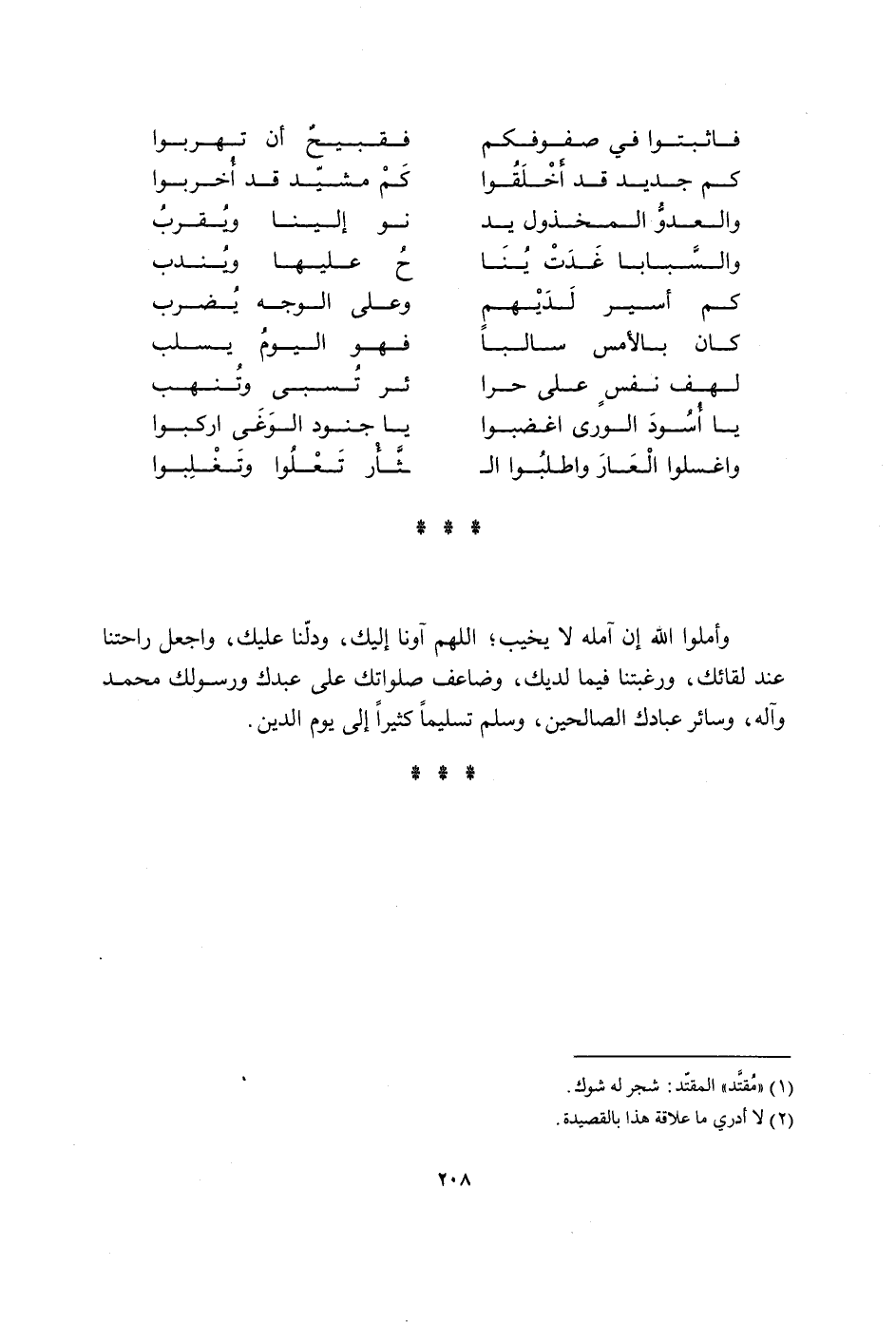 فاثبتوا فِي صفوفكم فقبيح ان تهربوا كم جَدِيد قد أخلقوا كم مشيد قد أخربوا والعدو المخذول يَد نو إِلَيْنَا وَيقرب والسبابا غَدَتْ ينا ح عَلَيْهَا وَينْدب كم أَسِير لديهم وعَلى الْوَجْه يضْرب كَانَ بالْأَمْس سالبا فَهُوَ الْيَوْم يسلب لهف نفس على حرا ئر تسبى وتنهب يَا أسود الورى اغضبوا يَا جنود الوغى اركبوا واغسلوا الْعَار واطلبوا الثأر تعلوا وتغلبوا وأملوا الله إِن آمله لَا يخيب اللَّهُمَّ آونا إِلَيْك ودلنا عَلَيْك وَاجعَل راحتنا عِنْد لقائك ورغبتنا فِيمَا لديك وضاعف صلواتك على عَبدك وَرَسُولك مُحَمَّد وَآله وَسَائِر عِبَادك الصَّالِحين وَسلم تَسْلِيمًا كثيرا إِلَى يَوْم الدّين