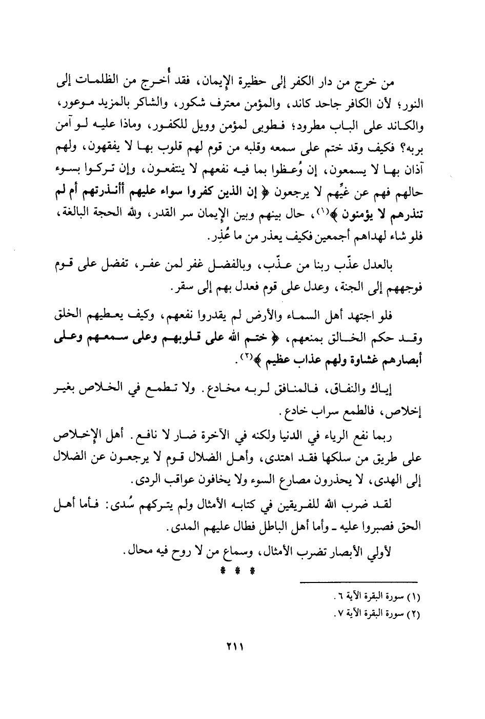 من خرج من دَار الْكفْر إِلَى دَار حَظِيرَة الْإِيمَان فقد أخرج من الظُّلُمَات إِلَى النُّور لِأَن الْكَافِر جَاحد كاند وَالْمُؤمن معترف شكور والشاكر بالمزيد موعور والكاند على الْبَاب مطرود فطوبى لِلْمُؤمنِ وويل للكفور وماذا عَلَيْهِ لَو آمن بربه فَكيف وَقد ختم على سَمعه وَقَلبه من قوم لَهُم من قُلُوب بهَا لَا يفقهُونَ وَلَهُم آذان بهَا لَا يسمعُونَ إِن وعظوا بِمَا فِيهِ نفعهم لَا يَنْتَفِعُونَ وَإِن تركُوا بِسوء حَالهم فهم عَن غيهم لَا يرجعونإن الَّذين كفرُوا سَوَاء عَلَيْهِم أأنذرتهم ام لم تنذرهم لَا يُؤمنُونَ حَال بَينهم وَبَين الْإِيمَان سر الْقدر وَللَّه الْحجَّة الْبَالِغَة فَلَو شَاءَ لهداهم أَجْمَعِينَ فَكيف يعْذر من مَا عذر بِالْعَدْلِ عذب رَبنَا من عذب وبالفضل غفر لمن غفر تفضل على قوم فوجههم إِلَى الْجنَّة وَعدل على قوم فَعدل بهم إِلَى سقر فَلَو اجْتهد اهل السَّمَاء وَالْأَرْض لم يقدروا نفعهم وَكَيف يعطيهم الْخلق وَقد حكم الْخَالِق بمنعهم ختم الله على قُلُوبهم وعَلى سمعهم وعَلى أَبْصَارهم غشاوة وَلَهُم عَذَاب عَظِيم إياك والنفاق فالمنافق لرَبه مخادع وَلَا تطمع فِي الْخَلَاص بِغَيْر إخلاص فالطمع سراب خَادع رُبمَا نفع الرِّيَاء فِي الدُّنْيَا وَلكنه فِي الْآخِرَة ضار لَا نَافِع أهل الْإِخْلَاص على طَرِيق من سلكها فقد اهْتَدَى وَأهل الضلال قوم لَا يرجعُونَ عَن الضلال إِلَى الْهدى لَا يحذرون مصَارِع السوء وَلَا يخَافُونَ عواقب الردى لقد ضرب الله لِلْفَرِيقَيْنِ فِي كِتَابه الْأَمْثَال وَلم يتركهم سدى فَأَما اهل الْحق فصبروا عَلَيْهِ وَأما اهل الْبَاطِل فطال عَلَيْهِم المدى لأولي الْأَبْصَار تضرب الْأَمْثَال وَسَمَاع من لَا روح فِيهِ محَال