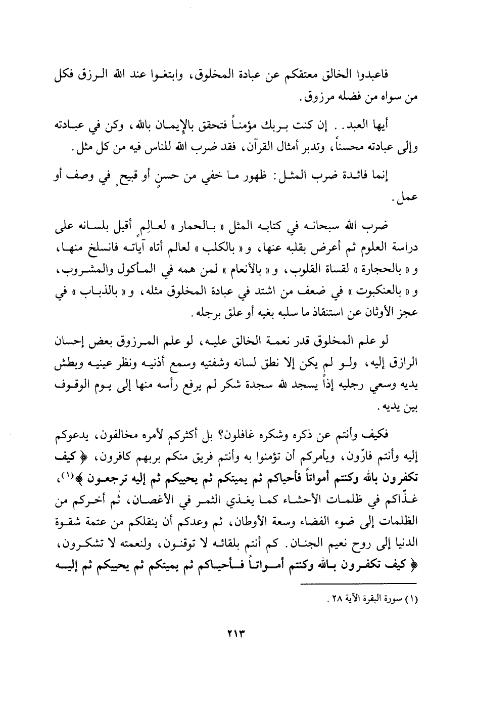 فاعبدوا الْخَالِق معتقكم عَن عبَادَة الْمَخْلُوق وابتغوا عِنْد الله الرزق فَكل من سواهُ من فَضله مَرْزُوق أَيهَا العَبْد إِن كنت بِرَبِّك مُؤمنا فتحقق بِالْإِيمَان بِاللَّه وَكن فِي عِبَادَته وَإِلَى عِبَادَته محسنا وتدبر أَمْثَال الْقُرْآن فقد ضرب الله للنَّاس فِيهِ من كل مثل إِنَّمَا فَائِدَة ضرب الْمثل ظُهُور مَا خَفِي من حسن أَو قَبِيح فِي وصف أَو عمل ضرب الله سُبْحَانَهُ فِي كِتَابه الْمثل بالحمار لعالم أقبل بِلِسَانِهِ على دراسة الْعُلُوم ثمَّ أعرض بِقَلْبِه عَنْهَا وبالكلبلعالم أَتَاهُ آيَاته فانسلخ مِنْهَا وبالحجارة لقساة الْقُلُوب وبالأنعام لمن همه فِي الْمَأْكُول والمشروب وبالعنكبوت فِي ضعف من اشْتَدَّ فِي عبَادَة الْمَخْلُوق مثله وبالذباب فِي عجز الْأَوْثَان عَن استنفاذ مَا سلبه بغيه أَو علق بِرجلِهِ لَو علم الْمَخْلُوق قدر نعْمَة الْخَالِق عَلَيْهِ لَو علم المرزوق بعض إِحْسَان الرازق إِلَيْهِ وَلَو لم يكن إِلَّا نطق لِسَانه وشفتيه وَسمع أُذُنَيْهِ وَنظر عَيْنَيْهِ وبطش يَدَيْهِ وسعي رجلَيْهِ إِذا يسْجد لله سَجْدَة شكر لم يرفع رَأسه مِنْهَا إِلَى يَوْم الْوُقُوف بَين يَدَيْهِ فَكيف وانتم عَن ذكره وشكره غافلون بل أَكْثَرَكُم لأَمره مخالفون يدعوكم إِلَيْهِ وَأَنْتُم فارون ويأمركم أَن تؤمنوا بِهِ وَأَنْتُم فريق مِنْكُم برَبهمْ كافرون كَيفَ تكفرون بِاللَّه وكنتم أَمْوَاتًا فأحياكم ثمَّ يميتكم ثمَّ يُحْيِيكُمْ ثمَّ إِلَيْهِ ترجعون غذاكم فِي ظلمات الأحشاء كَمَا يغذي الثَّمر فِي الأغصان ثمَّ أخرجكم من الظُّلُمَات إِلَى ضوء الفضاء وسعة الأوطان ثمَّ وَعدكُم أَن ينقلكم من عتمة شقوة الدُّنْيَا إِلَى روح نعيم الْجنان كم أَنْتُم بلقائه لَا توقنون ولنعمته لَا تشكرون كَيفَ تكفرون بِاللَّه وكنتم أَمْوَاتًا فأحياكم ثمَّ يميتكم ثمَّ يُحْيِيكُمْ ثمَّ إِلَيْهِ