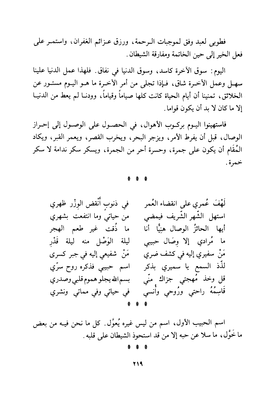 فطوبى لعبد وفْق لموجبات الرَّحْمَة ورزق عزائم الغفران واستمرعلى فعل الْخَيْر إِلَى حِين الخاتمة ومفارقة الشَّيْطَان الْيَوْم سوق الْآخِرَة كاسر وسوق الاخرة كاسد وسوق الدُّنْيَا فِي نفاق فَلهَذَا عمل الدُّنْيَا علينا سهل وَعمل الآخر شاق فَإِذا تجلى من امْر الْآخِرَة مَا هُوَ الْيَوْم مَسْتُور عَن الْخَلَائق تمنيا أَن أَيَّام الْحَيَاة كَانَت كلهَا صياما وقياما وودنا لم يُعْط من الدُّنْيَا إِلَّا مَا كَانَ لَا بُد أَن يكون قواما فاستهينوا الْيَوْم بركوب الْأَهْوَال فِي الْحُصُول على الْوُصُول إِلَى إِحْرَاز الْوِصَال قبل أَن يفرط الْأَمر ويزجر الْبَحْر وَيخرب الْقصر ويعمر الْقَبْر ويكاد الْمقَام أَن يكون على جَمْرَة وحسرة أحر من الْجَمْرَة ويسكر سكر ندامة لَا سكر خمرة لهف عمري على انْقِضَاء الْعُمر فِي ذنُوب أنقض الْوزر ظَهْري اسْتهلّ الشَّهْر الشريف فيمضي من حَياتِي وَمَا انتفعت بشهري أَيهَا الْحَائِز الْوِصَال هنيا أَنا مَا ذقت غير طعم الهجر مَا مرادي إِلَّا وصال حَبِيبِي لَيْلَة الْوَصْل مِنْهُ لَيْلَة قدر من سفيري إِلَيْهِ فِي كشف ضري من شفيعي إِلَيْهِ فِي جبر كسري لذذ السّمع يَا سميري بِذكر اسْم حَبِيبِي فَذكره روح سري قل وَخذ مهجتي جَزَاك مني بِسم الله يجلو هموم قلبِي قاسمه راحتي وروحي وأنسي فِي حَياتِي وَفِي مماتي ونشري اسْم الحبيب الأول اسْم من لَيْسَ غَيره يعول كل مَا نَحن فِيهِ من بعض مَا خول مَا سلا عَن حبه إِلَّا حبه إِلَّا من قد استحوذ الشَّيْطَان على قلبه