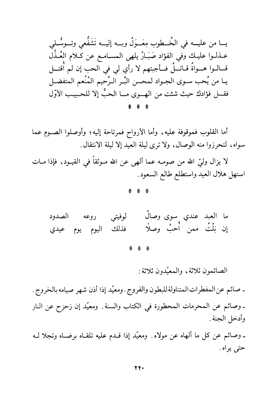 يَا من عَلَيْهِ فِي الخطوب معول وَبِه إِلَيْهِ تشفعي وتوسلي عذلوا عَلَيْك وَفِي الْفُؤَاد صبار يلهى المسامع عَن كَلَام العذل قَالُوا هواة قَاتل فأجبتهم لَا رَأْي لي فِي الْحبّ إِن لم أقتل يَا من يحب سوى الْجواد لمحسن الْبر الرَّحِيم الْمُنعم المتفضل فَقل فُؤَادك حَيْثُ شِئْت من الْهوى مَا الْحبّ إِلَّا للحبيب الأول أما الْقُلُوب فموقوفة عَلَيْهِ وَأما الْأَرْوَاح فمرتاحة إِلَيْهِ وأوصلوا الصَّوْم عَمَّا سواهُ لتحرزوا مِنْهُ الْوِصَال وَلَا ترى لَيْلَة أَلا لَيْلَة الإنتقال لَا يزَال ولي الله من صَوْمه عَمَّا ألهى عَن الله موثقًا فِي الْقُيُود فَإِذا مَاتَ اسْتهلّ هِلَال الْعِيد واستطلع طالع السُّعُود مَا العَبْد عِنْدِي سوى وصال لوفيتي روعة الصدود إِن نلْت مِمَّن أحب وصلا فَذَلِك الْيَوْم يَوْم عيدي الصائمون ثَلَاثَة والمعيدون ثَلَاثَة صَائِم عَن المفطرات المتناولة للبطون والفروج ومعيد إِذا أذن شهر صِيَامه بِالْخرُوجِ وصائم عَن الْمُحرمَات المحظورة فِي الْكتاب وَالسّنة ومعيد إِن زحزح عَن النَّار وَأدْخل الْجنَّة وصائم عَن كل مَا ألهاه عَن مَوْلَاهُ ومعيد إِذا قدم عَلَيْهِ تَلقاهُ بِرِضَاهُ وتجلا لَهُ حَتَّى يرَاهُ