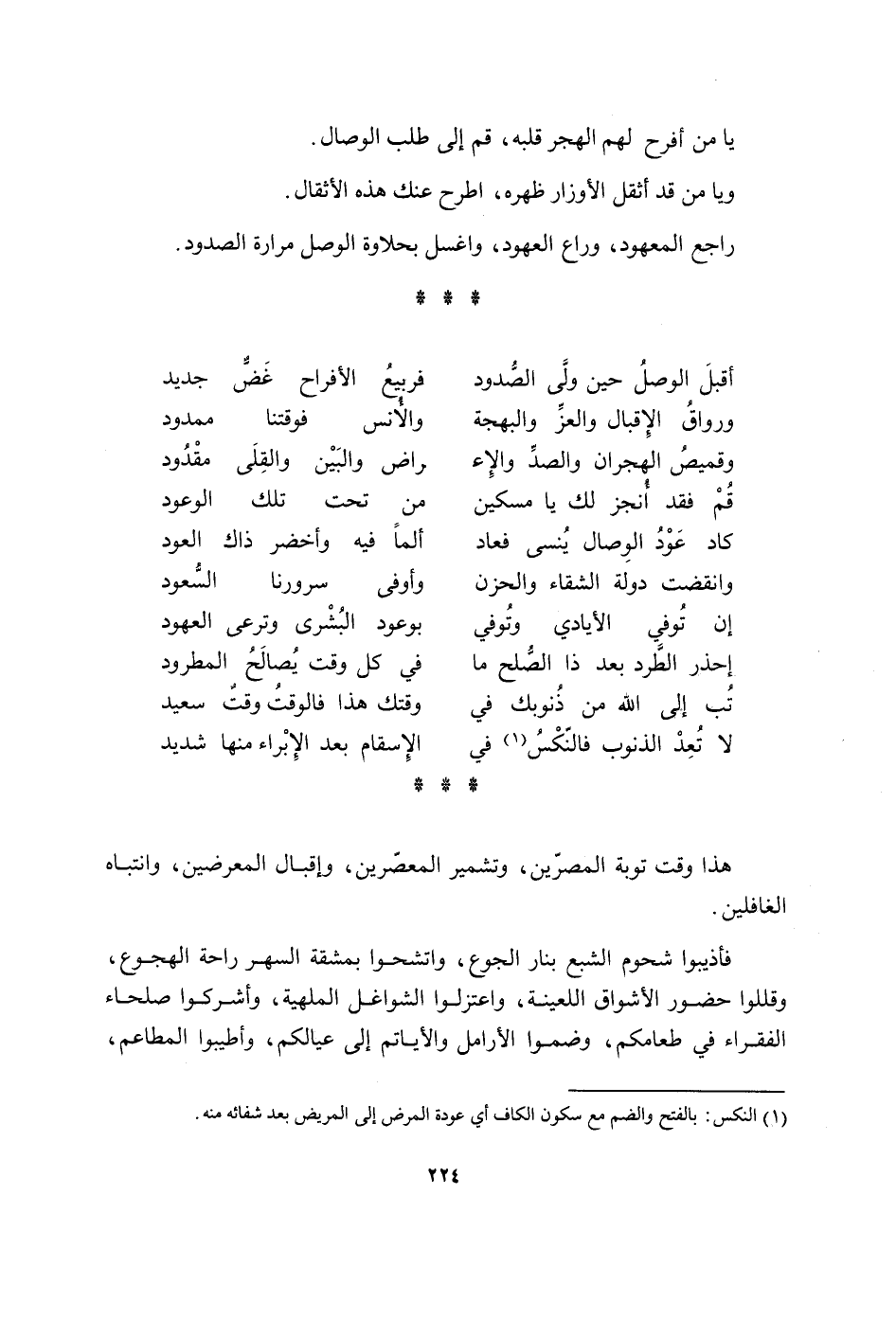 يَا من افرح لَهُم الهجر قلبه قُم إِلَى طلب الْوِصَال وَيَا من قد أثقل الأوزار طهره اطرَح عَنْك هَذِه الأثقال رَاجع الْمَعْهُود وراع العهود واغسل بحلاوة الْوَصْل مرَارَة الصدود أقبل الْوَصْل حِين ولى الصدود فربيع الفراح غض جَدِيد ورواق الإقبال والعز والبهجة والأنس فوقتنا مَمْدُود وقميص الهجران والصد ة الْإِعْرَاض والبين والقلى مقدود قُم فقد أنْجز لَك يَا مِسْكين من تَحت تِلْكَ الوعود كَاد عود الْوِصَال ينسى فَعَاد ألما فِيهِ وأخضر ذَاك الْعود وَانْقَضَت دولة الشَّقَاء والحزن واوفى سرورنا السُّعُود إِن توفّي الأيادي وَتُوفِّي بوعود الْبُشْرَى وترعى العهود إحذر الطَّرْد بعد ذَا الصُّلْح مَا فِي كل وَقت يُصَالح المطرود تب إِلَى الله من ذنوبك فِي وقتك هَذَا فالوقت وَقت سعيد لَا تعد الذُّنُوب فالنكس فِي الإسقام بعد الْإِبْرَاء مِنْهَا شَدِيد هَذَا وَقت تَوْبَة المصرين وتشمير المعصرين وإقبال المعرضين وانتباه الغافلين فأذيبوا شحوم الشِّبَع بِنَار الْجُوع واتشحوا بِمَشَقَّة السهر رَاحَة الهجوع وقللوا حُضُور الأشواق اللعينة واعتزلوا الشواغل الملهية وأشركوا صلحاء الْفُقَرَاء فِي طَعَامكُمْ وضموا الأرامل والأياتم إِلَى عيالكم وأطيبوا المطاعم