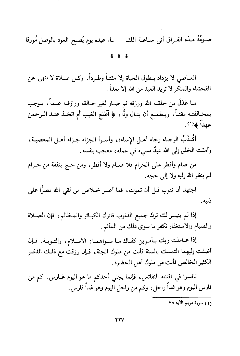 صَوْمه مده الفاق اتى سَاعَة اللِّقَاء عيده يَوْم يصبح الْعود بالوصل مورقا العَاصِي لَا يزْدَاد بطول الْحَيَاة إِلَّا مقتا وطردا وكل صَلَاة لَا تنْهى عَن الْفَحْشَاء وَالْمُنكر لَا تزيد العَبْد من الله إِلَّا بعدا مَا عدل من خلقه الله ورزقه ثمَّ صَار لغير خالقه ورازقه عبدا يُوجب بمخالفته مقتا ويطمع أَن ينَال ودا أطلع الْغَيْب أم اتخذ عِنْد الرَّحْمَن عهدا أكذب الرَّجَاء رَجَاء أهل الْإِسَاءَة وأسوأ الْجَزَاء جَزَاء اهل الْمعْصِيَة وامقت الْخلق إِلَى الله عبد مسيء فِي عمله معجب بِنَفسِهِ من صَامَ وَأفْطر على الْحَرَام فَلَا صَامَ وَلَا افطر وَمن حج بِنَفَقَة من حرَام لم ينظر الله إِلَيْهِ وَلَا إِلَى حجه اجْتهد أَن تتوب قبل ان تَمُوت فَمَا أعْسر خلاص من لَقِي الله مصرا على ذَنبه إِذا لم يَتَيَسَّر لَك ترك جَمِيع الذُّنُوب فاترك الْكَبَائِر والمظالم فَإِن الصَّلَاة وَالصِّيَام والإستغفار تكفر مَا سوى ذَلِك من المأثم إِذا عاملت رَبك بأمرين كَفاك مَا سواهُمَا الاسلام وَالتَّوْبَة فَإِن أضفت إِلَيْهِمَا التَّمَسُّك بِالسنةِ فَأَنت من مُلُوك الْجنَّة فَإِن رزقت مَعَ ذَلِك الذّكر الْكثير الْخَالِص فَأَنت من مُلُوك أهل الحضرة نافسوا فِي اقتناء النفائس فَإِنَّمَا يجني أحدكُم مَا هُوَ الْيَوْم غارس كم من فَارس الْيَوْم وَهُوَ غَدا راحل وَكم من راحل الْيَوْم وَهُوَ غَدا فَارس