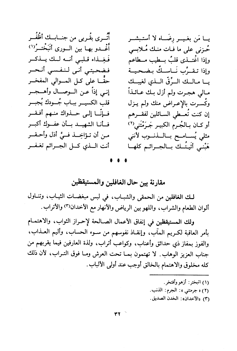 لَك الغافلين من الحمقى والشباب فِي لبس مبغضات الثِّيَاب وَتَنَاول الوان الطَّعَام وَالشرَاب وَاللَّهْو بَين الرياض والأنهار مَعَ الاخذان والاتراب وَلَك المستيقظين فِي انفاق الاعمال الصَّالِحَة لاحراز الثَّوَاب والاهتمام بِأَمْر الْعَاقِبَة لكريم المآب وانقاذ نُفُوسهم من سوء الْحساب واليم الْعَذَاب والفوز بمفاز ذِي حدائق واعناب وكواعب اتراب وَلَذَّة العارفين فِيمَا يقربهُمْ من جنَّات الْعَزِيز الْوَهَّاب لَا تهتمون بِمَا تَحت الْعَرْش وَمَا فَوق التُّرَاب لَان ذَلِك كُله مَخْلُوق والاهتمام بالخالق اوجب عِنْد اولى الالباب