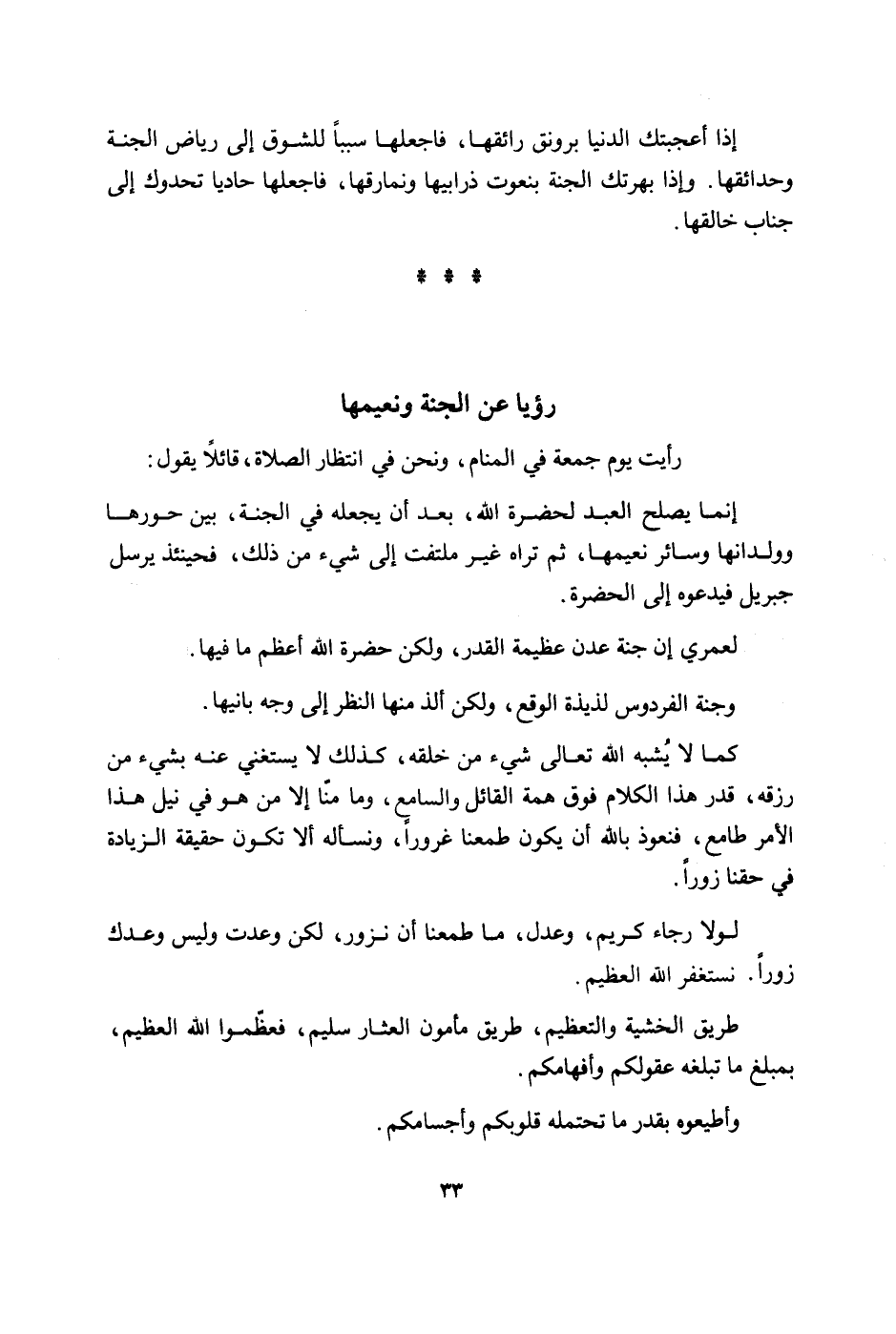 رَأَيْت يَوْم جُمُعَة فِي الْمَنَام وَنحن فِي انْتِظَار الصَّلَاة قَائِلا يَقُول انما يصلح العَبْد لحضرة الله بعد ان يَجعله فِي الْجنَّة بَين حورها وولدانها وَسَائِر نعيمها ثمَّ ترَاهُ غير ملتفت الى شَيْء من ذَلِك فَحِينَئِذٍ يُرْسل جِبْرِيل فيدعوه الى الحضرة لعمري ان جنَّة عدن عَظِيمَة الْقدر وَلَكِن حَضْرَة الله اعظم مَا فِيهَا وجنة الفردوس لذيذة الوقع وَلَكِن الذ مِنْهَا النّظر الى وَجه بانيها كَمَا لَا يشبه الله تَعَالَى شَيْء من خلقه كَذَلِك لَا يَسْتَغْنِي عَنهُ بِشَيْء من رزقه قدر هَذَا الْكَلَام فَوق همة الْقَائِل وَالسَّامِع وَمَا منا الا من هُوَ نيل هَذَا الامر طامع فنعوذ بِاللَّه ان يكون طمعنا غرُورًا ونسأله الا تكون حَقِيقَة الزِّيَادَة فِي حَقنا زورا لَوْلَا رَجَاء كريم وَعدل مَا طمعنا ان نزور لَكِن وعدت وَلَيْسَ وَعدك زورا نَسْتَغْفِر الله الْعَظِيم طَرِيق الخشية والتعظيم طَرِيق مَأْمُون العثار سليم فَعَظمُوا الله الْعَظِيم بمبلغ مَا تبلغه عقولكم وافهامكم واطيعوه بِقدر مَا تحتمله قُلُوبكُمْ واجسامكم