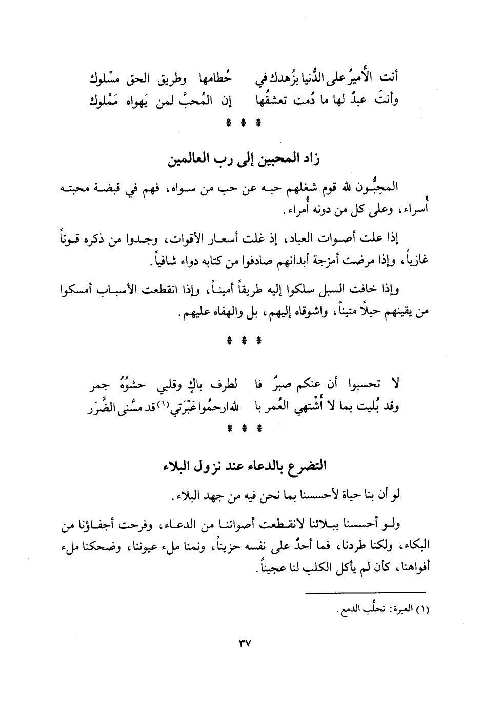 المحبون لله قوم شغلهمْ حبه عَن حب من سواهُ فهم فِي قَبْضَة محبته اسراء وعَلى كل من دونه امراء اذا علت اصوات الْعباد اذ غلت اسعار الاقوات وجدوا من ذكره قوتا غازيا واذا مَرضت امزجة ابدانهم صادفوا من كِتَابه دَوَاء شافيا واذا خَافت السبل سلكوا اليه طَرِيقا امينا واذا انْقَطَعت الاسباب امسكوا من يقينهم حبلا متينا واشوقاه اليهم بل والهفاه عَلَيْهِم لَا تحسبوا ان عَنْكُم صَبر فالطرف باك وقلبي حشْوَة جمر وَقد بليت بِمَا لَا اشتهي الْعُمر بِاللَّه ارحموا عبرتي قد مسني الضَّرَر