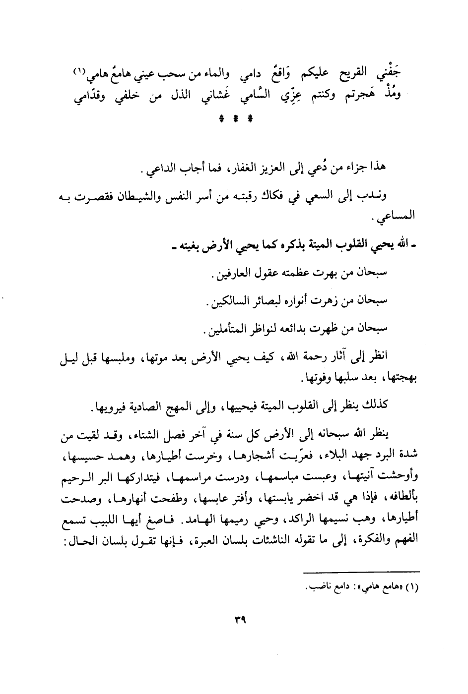 سُبْحَانَ من بهرت عَظمته عقول العارفين سُبْحَانَ من زهرت انواره لبصائر السالكين سُبْحَانَ من ظَهرت بدائعه لنواظر المتأملين انْظُر الى اثار رَحْمَة الله كَيفَ يحيي الارض بعد مَوتهَا وملبسها قبل ليل بهجتها بعد سلبها وفوتها كَذَلِك ينظر الى الْقُلُوب الْميتَة فيحييها والى المهج الصادقة فيرويها ينظر الله سُبْحَانَهُ الى الارض كل سنة فِي اخر فصل الشتَاء وَقد لقِيت من شدَّة الْبرد جهد الْبلَاء فعريت اشجارها وخرست اطيارها وهمد حَسِيسهَا وأوحشت آنيتها وعبست مباسمها ودرست مراسمها فيتداركها البرالرحيم بالطافه فَإِذا هِيَ قد اخضر يابستها وافتر عابسها وطفحت انهارها وصدحت اطيارها وهب نسيمها الراكد وحيي رميمها الهامد فاصغ ايها اللبيب تسمع الْفَهم والفكرة الى مَا تَقوله الناشئات بِلِسَان الْعبْرَة فانها تَقول بِلِسَان الْحَال