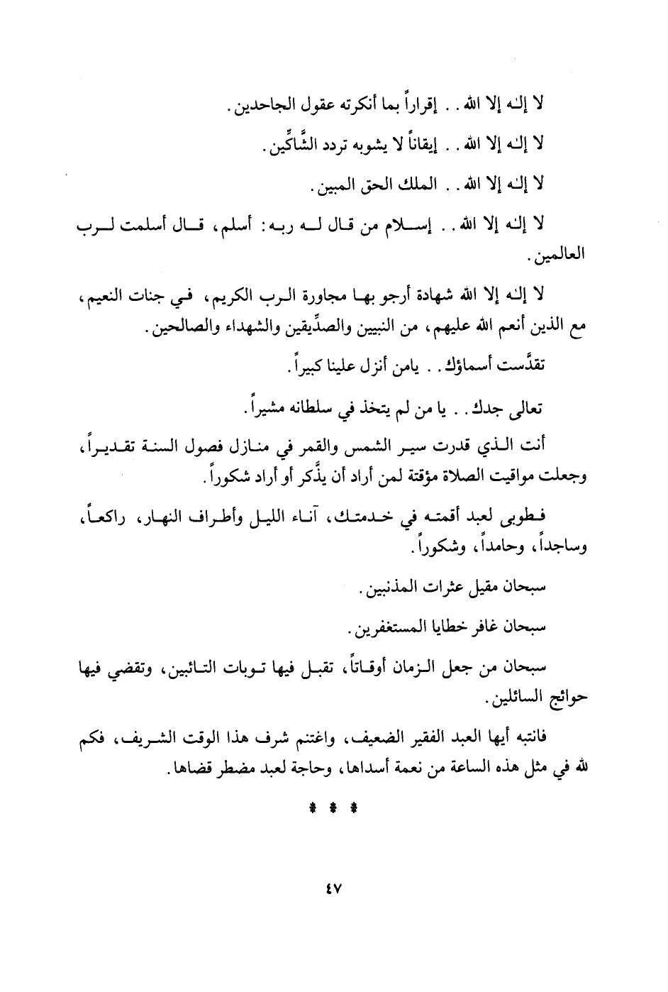 لَا اله الا الله اقرارا بِمَا انكرته عقول الجاحدين لَا اله الا الله ايقانا لَا يشوبه تردد الشاكين لَا اله الا الله الْملك الْحق الْمُبين لَا اله الا الله اسلام من قَالَ لَهُ ربه اسْلَمْ قَالَ اسلمت لرب الْعَالمين لَا اله الا الله شَهَادَة ارجو بهَا مجاورة الرب الْكَرِيم فِي جنَّات النَّعيم مَعَ الَّذين انْعمْ الله عَلَيْهِم من النَّبِيين وَالصديقين وَالشُّهَدَاء وَالصَّالِحِينَ تقدست أسماؤك يَا من انْزِلْ علينا كَبِيرا تَعَالَى جدك يَا من لم يتَّخذ فِي سُلْطَانه مُشِيرا انت الَّذِي قدرت سير الشَّمْس وَالْقَمَر فِي منَازِل فُصُول السّنة تَقْديرا وَجعلت مَوَاقِيت الصَّلَاة مُؤَقَّتَة لمن اراد ان يذكر اَوْ اراد شكُورًا فطوبى لعبد اقمته فِي خدمتك اناء اللَّيْل واطراف النَّهَار رَاكِعا وساجدا وحامدا وشكورا سُبْحَانَ مقيل عثرات المذنبين سُبْحَانَ غَافِر خَطَايَا المستغفرين سُبْحَانَ من جعل الزَّمَان اوقاتا تقبل فِيهَا توبات التائبين وتقضي فِيهَا حوائج السَّائِلين فانتبه أَيهَا العَبْد الْفَقِير الضَّعِيف واغتنم شرف هَذَا الْوَقْت الشريف فكم لله فِي مثل هَذِه السَّاعَة من نعْمَة اسداها وحاجة لعبد مُضْطَر قَضَاهَا
