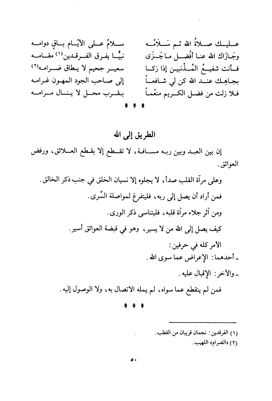 ان بَين العَبْد وَبَين ربه مَسَافَة لَا تقطع الا بِقطع العلائق ورفض الْعَوَائِق وعَلى مرْآة الْقلب صدأ لَا يجلوه الا نِسْيَان الْخلق فِي جنب ذكر الْخَالِق فَمن اراد ان يصل الى ربه فليتفرغ لمواصلة السرى وَمن اثر جلاء مرْآة قلبه فليتناسى ذكر الورى كَيفَ يصل الى الله من لَا يسير وَهُوَ فِي قَبْضَة الْعَوَائِق اسير الامر كُله فِي حرفين احدهما الاعراض عَمَّا سوى الله والاخر الاقبال عَلَيْهِ فَمن لم يَنْقَطِع عَمَّا سواهُ لم يمله الِاتِّصَال بِهِ وَلَا الْوُصُول اليه