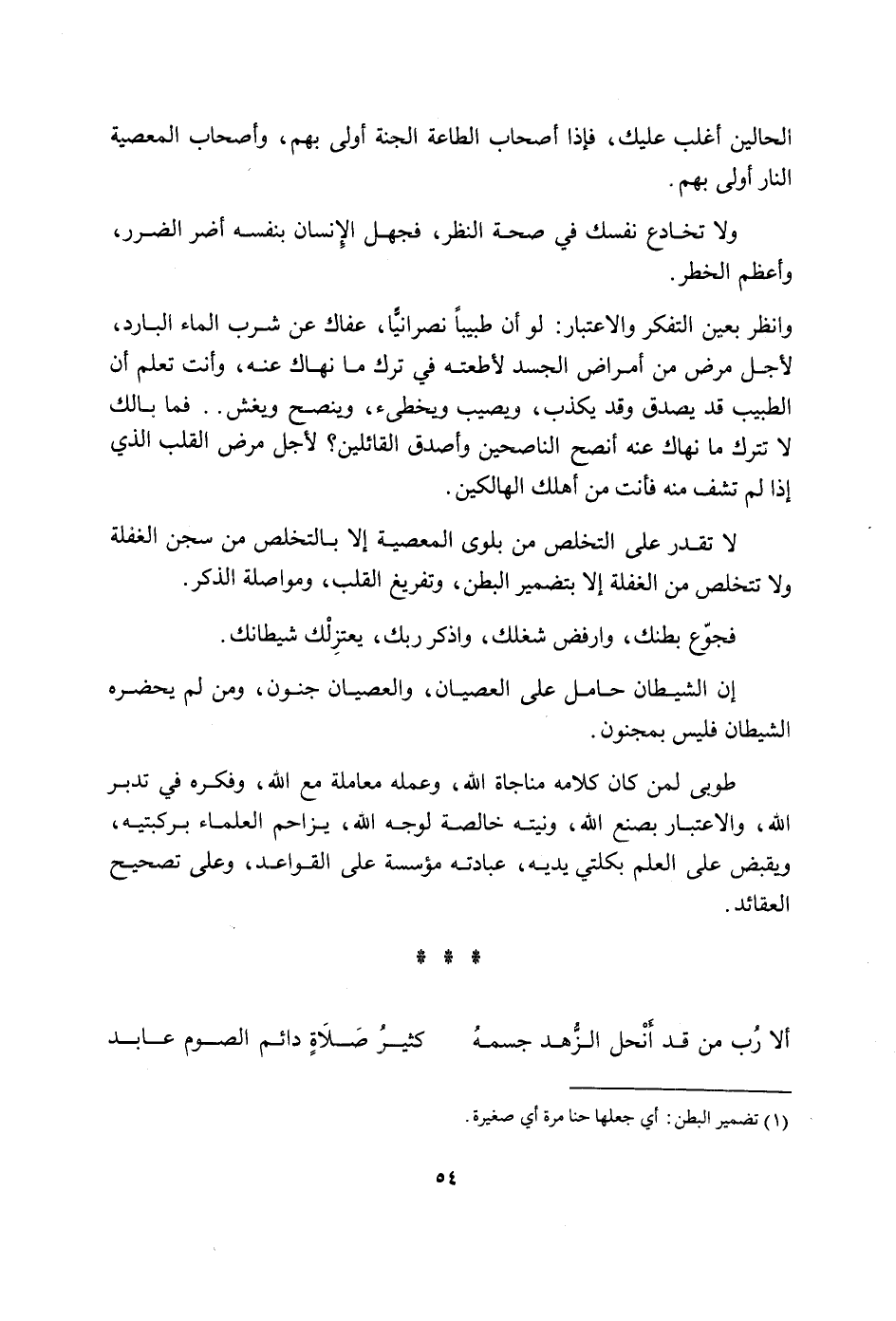 الْحَالين اغلب عَلَيْك فاذا اصحاب الطَّاعَة الْجنَّة اولى بهم واصحاب الْمعْصِيَة النَّار اولى بهم وَلَا تخادع نَفسك فِي صِحَة النّظر فجهل الانسان بِنَفسِهِ اضر الضَّرَر واعظم الْخطر وَانْظُر بِعَين التفكير وَالِاعْتِبَار لَو ان طَبِيبا نَصْرَانِيّا عَفَاك عَن شرب المَاء الْبَارِد لاجل مرض من امراض الْجَسَد لاطعته فِي ترك مَا نهاك عَنهُ وانت تعلم ان الطَّبِيب قد يصدق وَقد يكذب ويصيب ويخطىء وَينْصَح ويغش فَمَا بالك لَا تتْرك مَا نهاك عَنهُ انصح الناصحين واصدق الْقَائِلين لاجل مرض الْقلب الَّذِي اذا لم تشف مِنْهُ فَأَنت من اهلك الهالكين لَا تقدر على التَّخَلُّص من بلوى الْمعْصِيَة الا بالتخلص من سجن الْغَفْلَة وَلَا تتخلص من الْغَفْلَة الابتضمير الْبَطن وتفريغ الْقلب ومواصلة الذّكر فجوع بَطْنك وَارْفض شغلك وَاذْكُر رَبك يعتزلك شَيْطَانك ان الشَّيْطَان حَامِل على الْعِصْيَان والعصيان جُنُون وَمن لم يحضرهُ الشَّيْطَان فَلَيْسَ بمجنون طُوبَى لمن كَانَ كَلَامه مُنَاجَاة الله وَعَمله مُعَاملَة مَعَ الله وفكره فِي تدبر الله وَالِاعْتِبَار بصنع الله وَنِيَّته خَالِصَة لوجه الله يزاحم الْعلمَاء بركبتيه وَيقبض على الْعلم بكلتى يَدَيْهِ عِبَادَته مؤسسة على الْقَوَاعِد وعَلى تَصْحِيح العقائد الا رب من قد انحل الزّهْد جِسْمه كثير صَلَاة دَائِم الصَّوْم عَابِد