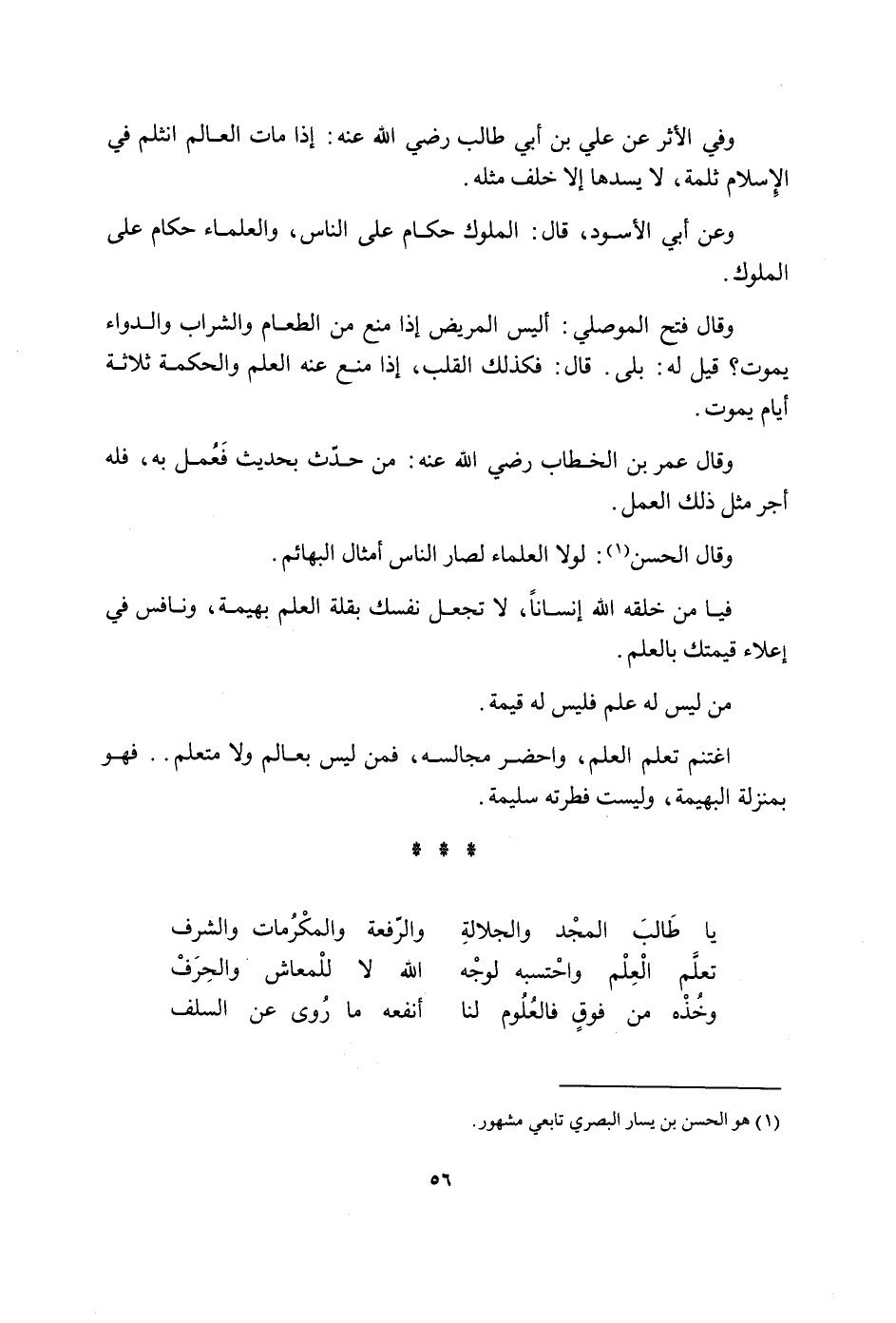 وَفِي الاثر عَن عَليّ بن ابي طَالب رَضِي الله عَنهُ اذا مَاتَ الْعَالم انثلم فِي الاسلام ثلمة لَا يسدها الا خلف مثله وَعَن ابي الاسود قَالَ الْمُلُوك حكام على النَّاس وَالْعُلَمَاء حكام على الْمُلُوك وَقَالَ فتح الْموصِلِي الْيَسْ الْمَرِيض اذا منع من الطَّعَام وَالشرَاب والدواء يَمُوت قيل لَهُ بلَى قَالَ فَكَذَلِك الْقلب اذا منع عَنهُ الْعلم وَالْحكمَة ثَلَاثَة ايام يَمُوت وَقَالَ عمر بن الْخطاب رَضِي الله عَنهُ من حدث بِحَدِيث فَعمل بِهِ فَلهُ اجْرِ مثل ذَلِك الْعَمَل وَقَالَ الْحسن لَوْلَا الْعلمَاء لصار النَّاس امثلهم امثال الْبَهَائِم فيا من خلقه الله انسانا لَا تجْعَل نَفسك بقلة الْعلم بَهِيمَة ونافس فِي اعلاء قيمتك بِالْعلمِ من لَيْسَ لَهُ علم فَلَيْسَ لَهُ قيمَة اغتنم تعلم الْعلم واحضر مجالسه فَمن لَيْسَ بعالم وَلَا متعلم فَهُوَ بمنزله الْبَهِيمَة وَلَيْسَت فطرته سليمَة يَا طَالب الْمجد وَالْجَلالَة والرفعة والمكرمات والشرف تعلم الْعلم واحتسبه لوجه الله لَا للمعاش والحرف وخذه من فَوق فالعلوم لنا انفعه مَا روى عَن السّلف