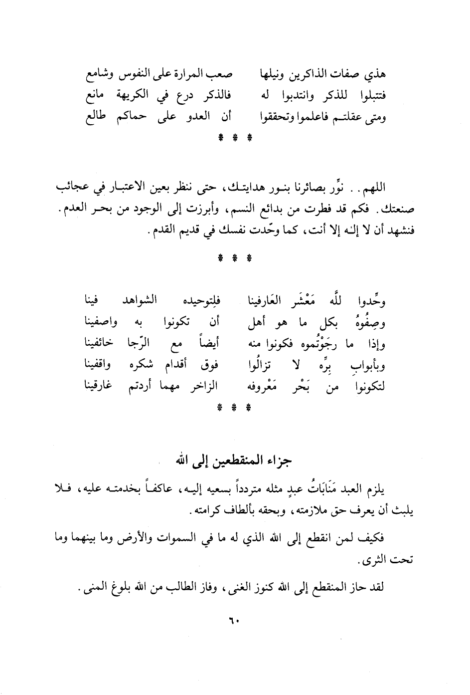 هذي صِفَات الذَّاكِرِينَ ونيلها صَعب المرارة على النُّفُوس وشامع فتتبلوا للذّكر وانتدبوا لَهُ فالذكر درع فِي الكريهة مَانع وَمَتى عقلتم فاعلموا وتحققوا ان الْعَدو على حماكم طالع اللَّهُمَّ نور بصائرنا بِنور هدايتك حَتَّى نَنْظُر بِعَين الِاعْتِبَار فِي عجائب صنعتك فكم قد فطرت من بَدَائِع النسم وابرزت الى الْوُجُود من بَحر الْعَدَم فنشهد ان لَا اله الا انت كَمَا وحدت نَفسك فِي قديم الْقدَم وحدوا لله معشر العارفينا فلتوحيده الشواهد فِينَا وصفوه بِكُل مَا هُوَ اهل ان تَكُونُوا بِهِ واصفينا واذا مَا رجوتموه فكونوا مِنْهُ ايضا مَعَ الرجا خائفينا وبأبواب بره لَا تزالوا فَوق اقدام شكره واقفينا لِتَكُونُوا من بَحر معروفه الزاجر مهما اردتم غارقينا