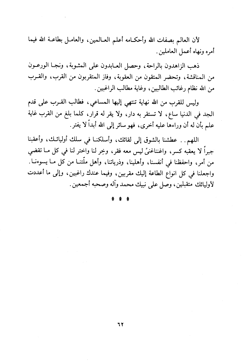 لَان الْعَالم بِصِفَات الله واحكامه اعْلَم الْعَالمين وَالْعَامِل بِطَاعَة الله فِيمَا امْرَهْ نَهَاهُ أعمل العاملين ذهب الزاهدون بالراحة وَحصل العابدون على المثوبة وَنَجَا الورعون من المناقشة وتحضر المتقون من الْعقُوبَة وفاز المتقربون من الْقرب والقرب من الله نطام رغائب الطالبين وَغَايَة مطَالب الراغبين وَلَيْسَ للقرب من الله نِهَايَة تَنْتَهِي اليها المساعي فطالب الْقرب على قدم الْجد فِي الدُّنْيَا ساع لَا تَسْتَقِر بِهِ دَار وَلَا يقر لَهُ قَرَار كلما بلغ من الْقرب غَايَة علم بِأَن لَهُ وَرَاءَهَا عَلَيْهِ اخرى فَهُوَ سَائِر الى الله ابدا لَا يفتر اللَّهُمَّ عطشنا بالشوق الى لقائك واسلكنا فِي سلك اوليائك واعقبنا جبرا لَا يعقبه كسر واغننا غنى لَيْسَ مَعَه فقر وخر لنا واختر لنا فِي كل مَا تقضي من امْر واحفظنا فِي انفسنا واهلينا وَذُرِّيَّاتنَا واهل ملتنا من كل مَا يسوءنا واجعلنا فِي كل انواع الطَّاعَة اليك مقربين وَفِيمَا عنْدك راغبين والى مَا اعددت لأوليائك متقبلين وصل على نبيك مُحَمَّد واله وَصَحبه اجمعين