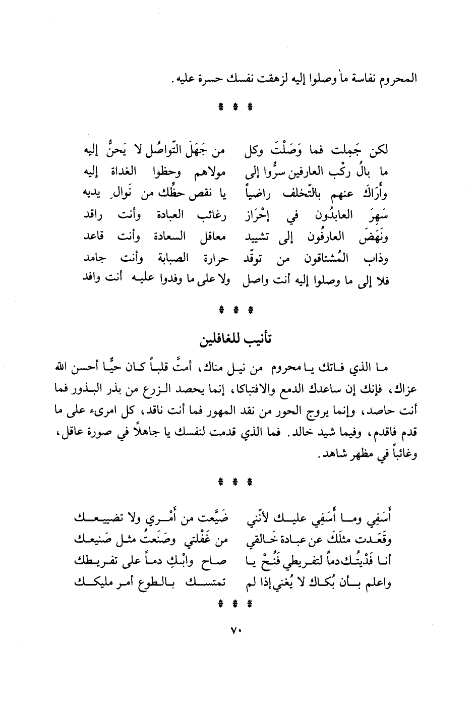 مَا الَّذِي فاتك يَا محروم من نيل مناك امت قلبا كَانَ حَيا احسن الله عزاك فَإنَّك ان ساعدك الدمع والافتباكا انما يحصد الزَّرْع من بذر البذور فَمَا انت حاصد وانما يروج الْحور من نقد المهور فَمَا انت ناقد كل امريء على مَا قدم فاقدم وَفِيمَا شيد خَالِد فَمَا الَّذِي قدمت لنَفسك يَا جَاهِلا فِي صُورَة عَاقل وغائبا فِي مظهر شَاهد اسفي وَمَا اسفي عَلَيْك لانني ضيعت من امري وَلَا تضييعك وَقَعَدت مثلك عَن عبَادَة خالقي من غفلتي وصنعت مثل صنيعك انا فديتك دَمًا لتفريطي فنح يَا صَاح وابك دَمًا على تفريطك وَاعْلَم بِأَن بكاك لَا يُغني اذا لم تمتسك بالطوع امْر مليكك