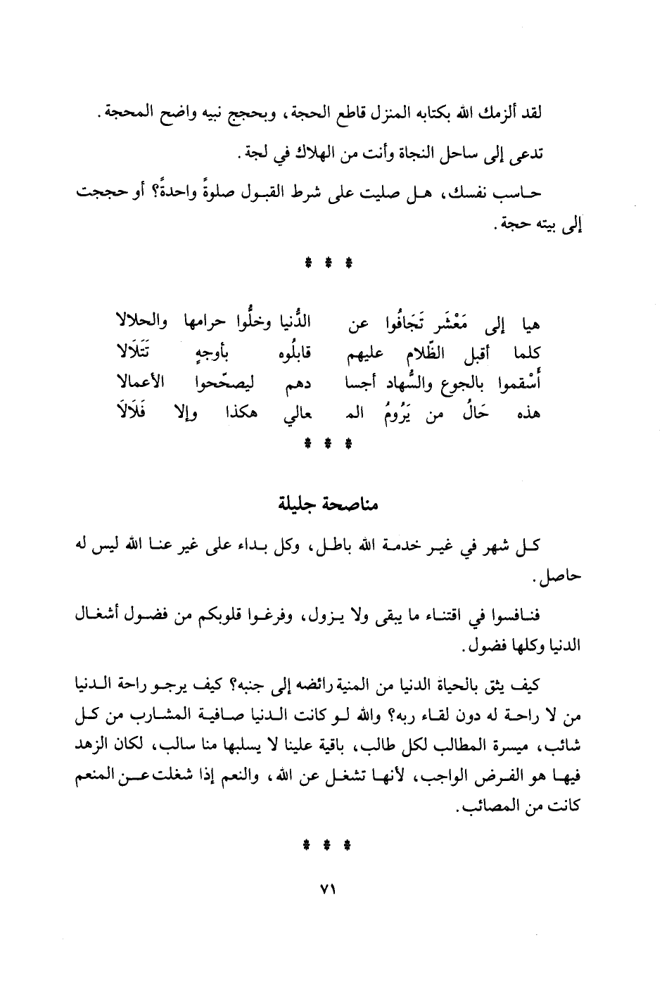 لقد الزمك الله بكتابه الْمنزل قَاطع الْحجَّة وبحجج نبيه وَاضح المحجة تدعى الى سَاحل النجَاة وانت من الْهَلَاك فِي لجة حاسب نَفسك هَل صليت على شَرط الْقبُول صَلَاة وَاحِدَة اَوْ حججْت الى بَيته حجَّة هيا الى معشر تجافوا عَن الدُّنْيَا وخلوا حرامها والحلالا كلما اقبل الظلام عَلَيْهِم قابلوه بأوجه تتلالا اسقموا بِالْجُوعِ والسهاد أجسا دهم ليصححوا الاعمال هَذِه حَال من يروم الْمَعَالِي هَكَذَا والا فلالا