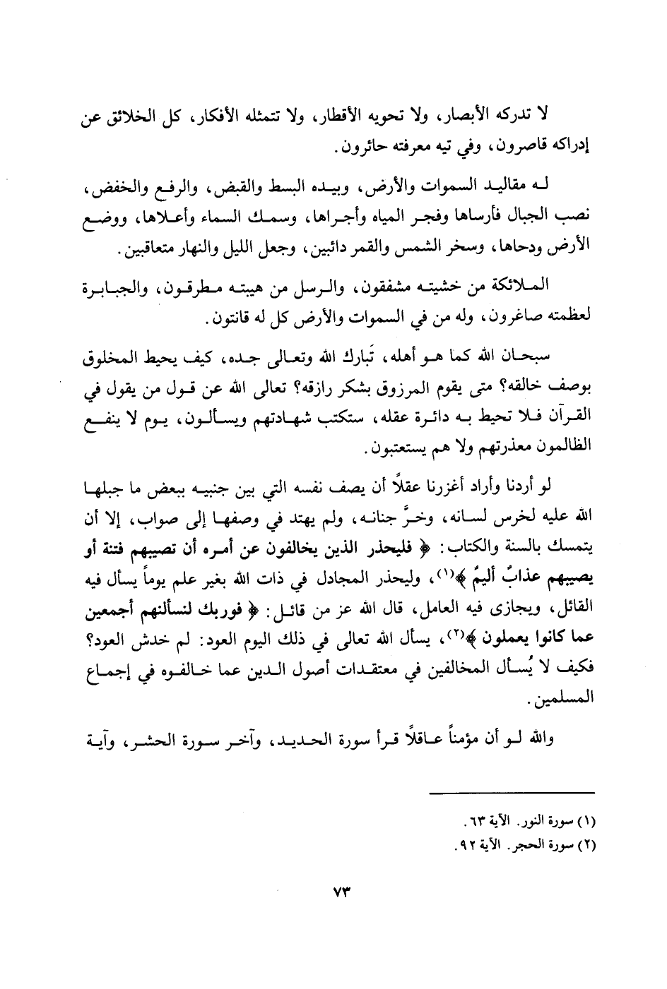 لَا تُدْرِكهُ الابصار وَلَا تحويه الاقطار وَلَا تثمله الافكار كل الْخَلَائق عَن ادراكه قاصرون وَفِي تيه مَعْرفَته حائرون لَهُ مقاليد السَّمَوَات والارض وَبِيَدِهِ الْبسط وَالْقَبْض وَالرَّفْع والخفض نصب الْجبَال فأرساها وفجر الْمِيَاه واجراها وسمك السَّمَاء واعلاها وَوضع الارض ودحاها وسخر الشَّمْس وَالْقَمَر دائبين وَجعل اللَّيْل وَالنَّهَار متعاقبين الْمَلَائِكَة من خَشيته مشفقون وَالرسل من هيبته مطرقون والجبابرة لعظمته صاغرون وَله من فِي السَّمَوَات والارض كل لَهُ قانتون سُبْحَانَ الله كَمَا هُوَ اهله تبَارك الله وَتَعَالَى جده كَيفَ يُحِيط الْمَخْلُوق بِوَصْف خالقه مَتى يقوم المرزوق بشكر رازقه تَعَالَى الله عَن قَول من يَقُول فِي الْقُرْآن فَلَا تحيط بِهِ دَائِرَة عقله ستكتب شَهَادَتهم ويسألون يَوْم لَا ينفع الظَّالِمُونَ معذرتهم وَلَا هم يستعتبون لَو اردنا واراد اغزرنا عقلا ان يصف نَفسه الَّتِي بَين جَنْبَيْهِ بِبَعْض مَا جبلها الله عَلَيْهِ لخرس لِسَانه وخر جنانه وَلم يهتد فِي وصفهَا الى صَوَاب الا ان يتَمَسَّك بِالسنةِ وَالْكتاب فليحذر الَّذين يخالفون عَن امْرَهْ ان تصيبهم فتْنَة اَوْ يصيبهم عَذَاب أَلِيم وليحذر المجادل فِي ذَات الله بِغَيْر علم يَوْمًا يسْأَل فِيهِ الْقَائِل ويجازى فِيهِ الْعَامِل قَالَ الله عز من قَائِل فوربك لنسألهم أَجْمَعِينَ عَمَّا كَانُوا يعْملُونَ يسْأَل الله تَعَالَى فِي ذَلِك الْيَوْم الْعود لم خدش الْعود فَكيف لَا يسْأَل الْمُخَالفين فِي معتقدات اصول الدّين عَمَّا خالفوه فِي اجماع الْمُسلمين وَالله لَو ان مُؤمنا عَاقِلا قَرَأَ سُورَة الْحَدِيد وَآخر سُورَة الْحَشْر وَآيَة