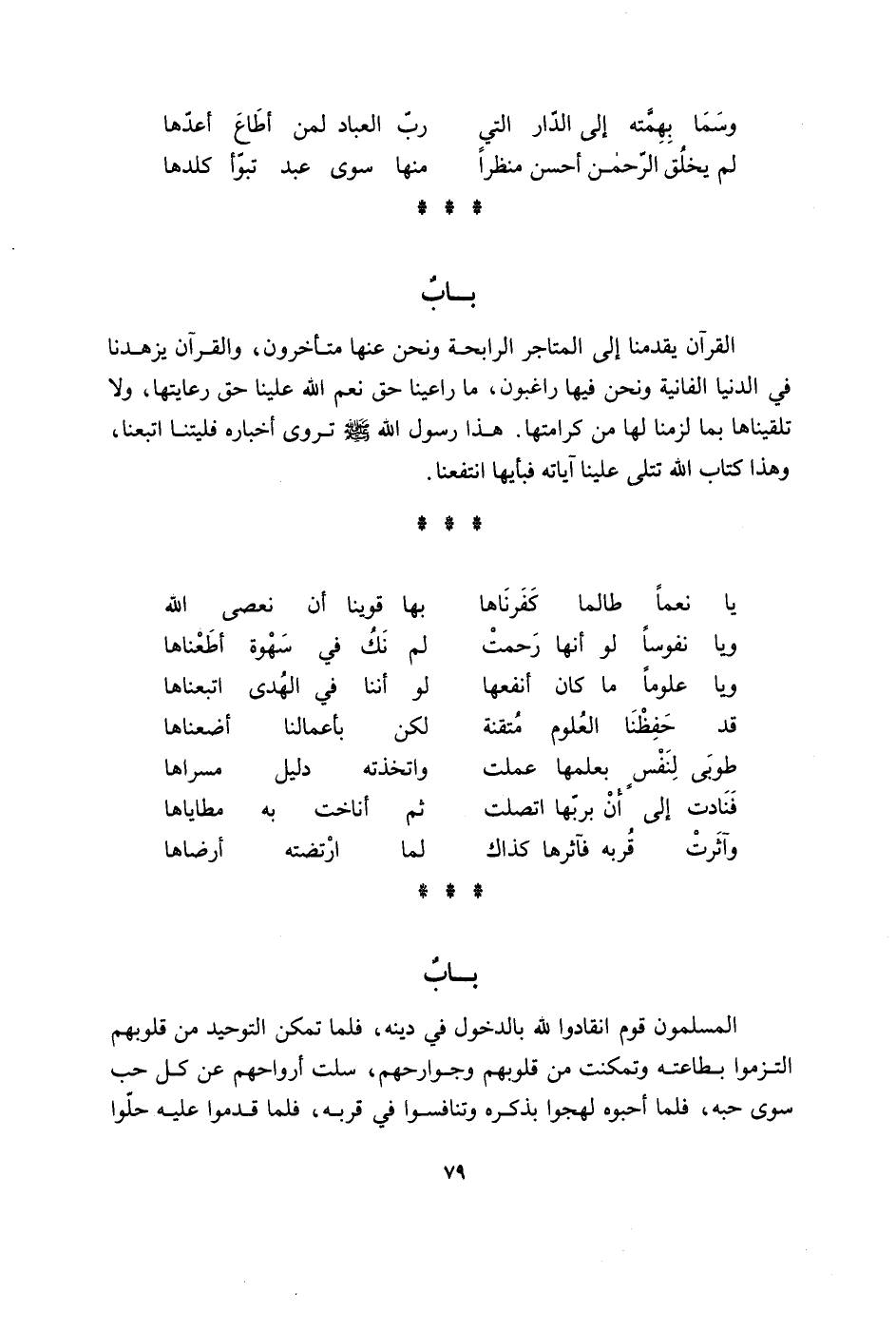 وسما بهمته الى الدَّار الَّتِي رب الْعباد لمن أطَاع أعدهَا لم يخلق الرَّحْمَن أحسن منْظرًا مِنْهَا سوى عبد تبوأ كلدها بَاب الْقُرْآن يقدمنا إِلَى المتاجر الرابحة وَنحن عَنْهَا متأخرون وَالْقُرْآن يزهدنا فِي الدُّنْيَا الفانية وَنحن فِيهَا راغبون مَا راعينا حق نعم الله علينا حق رعايتها وَلَا تلقيناها بِمَا لزمنا لَهَا من كرامتها هَذَا رَسُول الله صلى الله عَلَيْهِ وَسلم تروى أخباره فليتنا أتبعنا وَهَذَا كتاب الله تتلى علينا آيَاته فبأيها انتفعنا يَا نعما طالما كفرناها بهَا قوينا أَن نعصى الله وَيَا نفوسا لَو أَنَّهَا رحمت لم نك فِي سهوة أطعناها وَيَا علوما مَا كَانَ أنفعها لَو أننا فِي الْهدى اتبعناها قد حفظنا الْعُلُوم متقنة لَكِن بأعمالنا أضعناها طُوبَى لنَفس بعلمها عملت واتخذته دَلِيل مسراها فنادت إِلَى أَن بربها اتَّصَلت ثمَّ أناحت بِهِ مطاياها وآثرت قربه فآثرها كَذَاك لما ارتضته أرضاها بَاب الْمُسلمُونَ قوم انقادوا لله بِالدُّخُولِ فِي دينه فَلَمَّا تمكن التَّوْحِيد من قُلُوبهم التزموا بِطَاعَتِهِ وتمكنت من قُلُوبهم وجوارحهم سلت أَرْوَاحهم عَن كل حب سوى حبه فَلَمَّا أحبوه لهجوا بِذكرِهِ وتنافسوا فِي قربه فَلَمَّا قدمُوا عَلَيْهِ حلوا