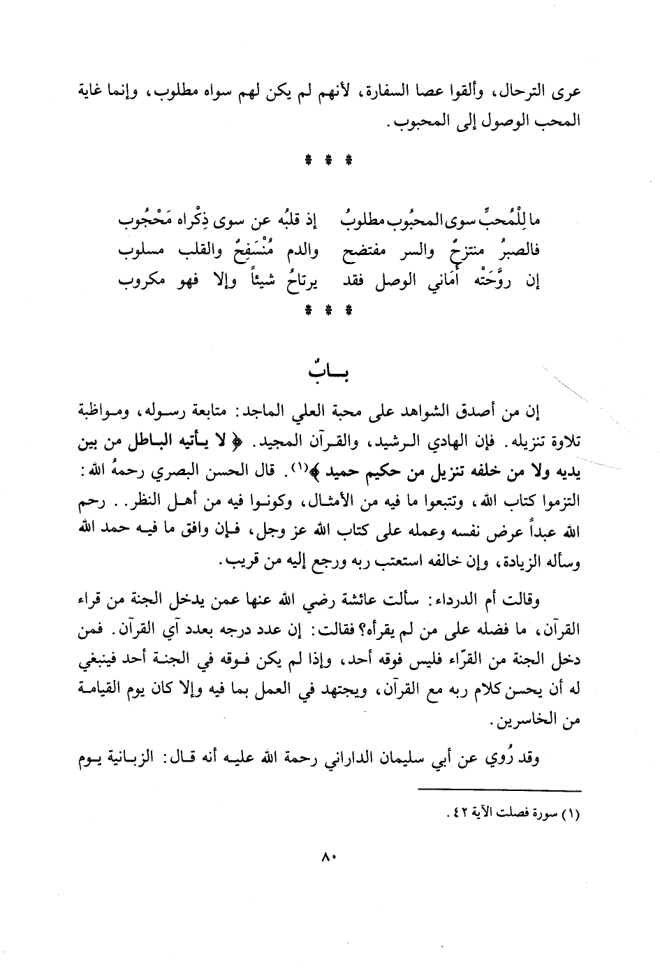 عرى الترحال وألقوا عَصا السفارة لأَنهم لم يكن لَهُم سواهُ مَطْلُوب وَإِنَّمَا غَايَة الْمُحب الْوُصُول إِلَى المحبوب مَا للمحب سوى المحبوب مَطْلُوب إِذْ قلبه عَن سوى ذكرَاهُ مَحْجُوب فالصبرمنتزح والسر مفتضح وَالدَّم منسفح وَالْقلب مسلوب إِن روحته أماني الْوَصْل فقد يرتاح شَيْئا وَإِلَّا فَهُوَ مكروب بَاب إِن من أصدق الشواهد على محبَّة الْعلي الْمَاجِد مُتَابعَة رَسُوله ومواظبة تِلَاوَة تَنْزِيله فَإِن الْهَادِي الرشيد وَالْقُرْآن الْمجِيد لَا يَأْتِيهِ الْبَاطِل من بَين يَدَيْهِ وَلَا من خَلفه تَنْزِيل من حَكِيم حميد قَالَ الْحسن الْبَصْرِيّ رَحمَه الله التزموا كتاب الله وتتبعوا مَا فِيهِ من الْأَمْثَال وَكُونُوا فِيهِ من أهل النّظر رحم الله عبدا عرض نَفسه وَعَمله على كتاب الله عز وَجل فَإِن وَافق مَا فِيهِ حمد الله وَسَأَلَهُ الزِّيَادَة وَإِن خَالفه استعتب ربه وَرجع إِلَيْهِ من قريب وَقَالَت أم الدَّرْدَاء سَأَلت عَائِشَة رَضِي الله عَنْهَا عَمَّن يدْخل الْجنَّة من قراء الْقُرْآن مَا فَضله على من لم يقرأه فَقَالَت إِن عدد دَرَجَة بِعَدَد آي الْقُرْآن فَمن دخل الْجنَّة من الْقُرَّاء فَلَيْسَ فَوْقه أحد وَإِذا لم يكن فَوْقه فِي الْجنَّة أحد فَيَنْبَغِي لَهُ ان يحسن كَلَام ربه مَعَ الْقُرْآن ويجتهد فِي الْعَمَل بِمَا فِيهِ وَإِلَّا كَانَ يَوْم القبامة من الخاسرين وَقد رُوِيَ عَن أبي سُلَيْمَان الدَّارَانِي رَحمَه الله عَلَيْهِ أَنه قَالَ الزَّبَانِيَة يَوْم