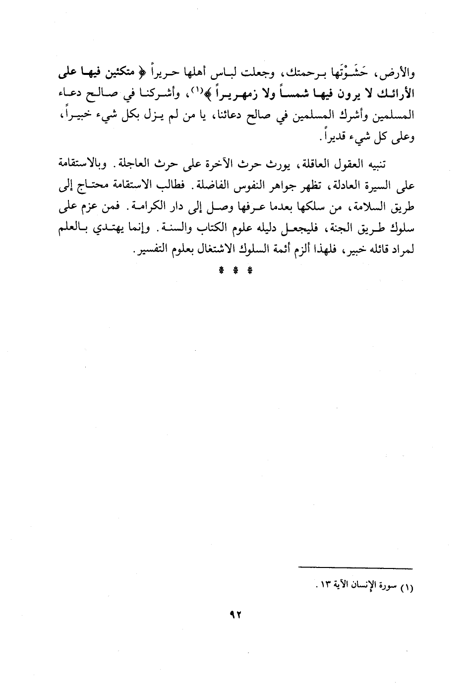 وَالْأَرْض حشوتها بِرَحْمَتك وَجعلت لِبَاس أَهلهَا حَرِيرًا متكئين فِيهَا على الأرائك لَا يرَوْنَ شمسا وَلَا زمهريرا وأشركنا فِي صَالح دُعَاء الْمُسلمين وأشرك الْمُسلمين فِي صَالح دعائنا يَا من لم يزل بِكُل شَيْء خَبِيرا وعَلى كل شَيْء قَدِيرًا تَنْبِيه الْعُقُول الْعَاقِلَة يُورث حرث الْآخِرَة على حرث العاجلة وبالاستقامة على السِّيرَة العادلة تظهر جَوَاهِر النُّفُوس الفاضلة فطالب الإستقامة مُحْتَاج إِلَى طَرِيق السَّلامَة من سلكها بَعْدَمَا عرفهَا وصل إِلَى دَار الْكَرَامَة فَمن عزم على سلوك طَرِيق الْجنَّة فليجعل دَلِيله عُلُوم الْكتاب وَالسّنة وَإِنَّمَا يَهْتَدِي بِالْعلمِ لمراد قَائِله خَبِير فَلهَذَا ألزم أَئِمَّة السلوك الِاشْتِغَال بعلوم التَّفْسِير