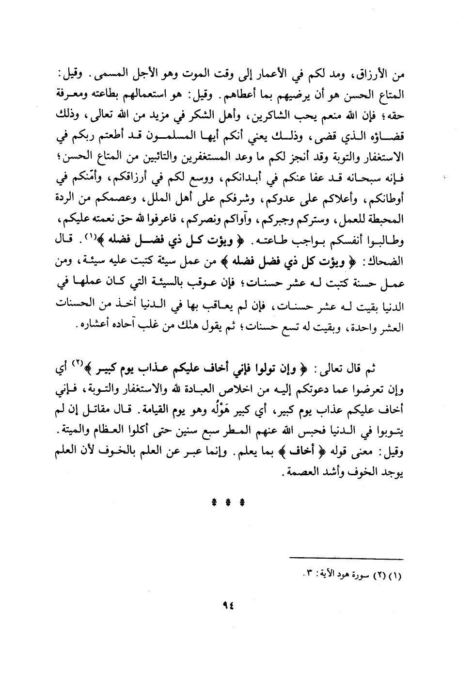 من الأرزاق وَمد لكم فِي الْأَعْمَار إِلَى وَقت الْمَوْت وَهُوَ الْأَجَل الْمُسَمّى وَقيل الْمَتَاع الْحسن هُوَ أَن يرضيهم بِمَا أَعْطَاهُم وَقيل هُوَ استعمالهم بِطَاعَتِهِ وَمَعْرِفَة حَقه فَإِن الله يحب الشَّاكِرِينَ وَأهل الشُّكْر فِي مزِيد من الله تَعَالَى وَذَلِكَ قَضَاؤُهُ الَّذِي قضى وَذَلِكَ يَعْنِي أَنكُمْ أَيهَا الْمُسلمُونَ قد أطعتم ربكُم فِي الاسْتِغْفَار وَالتَّوْبَة وَقد أنْجز لكم مَا وعد المستغفرين والتائبين من الْمَتَاع الْحسن فَإِنَّهُ سُبْحَانَهُ قد عَفا عَنْكُم فِي أبدانكم ووسع لكم فِي أرزاقكم وأمنكم فِي أوطانكم وأعلاكم على عَدوكُمْ وشرفكم على أهل الْملَل وعصمكم من الرِّدَّة المحبطة للْعَمَل وستركم وجبركم وآواكم ونصركم فاعرفوا لله حق نعْمَته عَلَيْكُم وطالبوا أَنفسكُم بِوَاجِب طَاعَته وَيُؤْت كل ذِي فضل فَضله قَالَ الضَّحَّاك وَيُؤْت كل ذِي فضل فَضله من عمل سَيِّئَة كتيت عَلَيْهِ سَيِّئَة وَمن عمل حَسَنَة كتبت لَهُ عشر حَسَنَات فَإِن عُوقِبَ بِالسَّيِّئَةِ الَّتِي كَانَ عَملهَا فِي الدُّنْيَا بقيت لَهُ عشر حَسَنَات فَإِن لم يُعَاقب بهَا فِي الدُّنْيَا أَخذ من الْحَسَنَات الْعشْر وَاحِدَة وَبقيت لَهُ تسع حَسَنَات ثمَّ يَقُول هلك من غلب آحاده عشرات ثمَّ قَالَ تَعَالَى وَإِن توَلّوا فَإِنِّي أَخَاف عَلَيْكُم عَذَاب يَوْم كَبِير أَي وَإِن تعرضوا عَمَّا دعوتكم إِلَيْهِ من اخلاص الْعِبَادَة لله وَالِاسْتِغْفَار وَالتَّوْبَة فَإِنِّي أَخَاف عَلَيْكُم عَذَاب يَوْم كَبِير أَي كَبِير هوله وَهُوَ يَوْم الْقَامَة قَالَ مقَاتل إِن لم يتوبوا فِي الدُّنْيَا فحبس الله عَنْهُم الْمَطَر سبع سِنِين حَتَّى أكلُوا الْعِظَام وَالْميتَة وَقيل معنى قَوْله أَخَاف بِمَا يعلم وَإِنَّمَا عبر عَن الْعلم بالخوف لِأَن الْعلم يُوجد الْخَوْف وَأَشد الْعِصْمَة