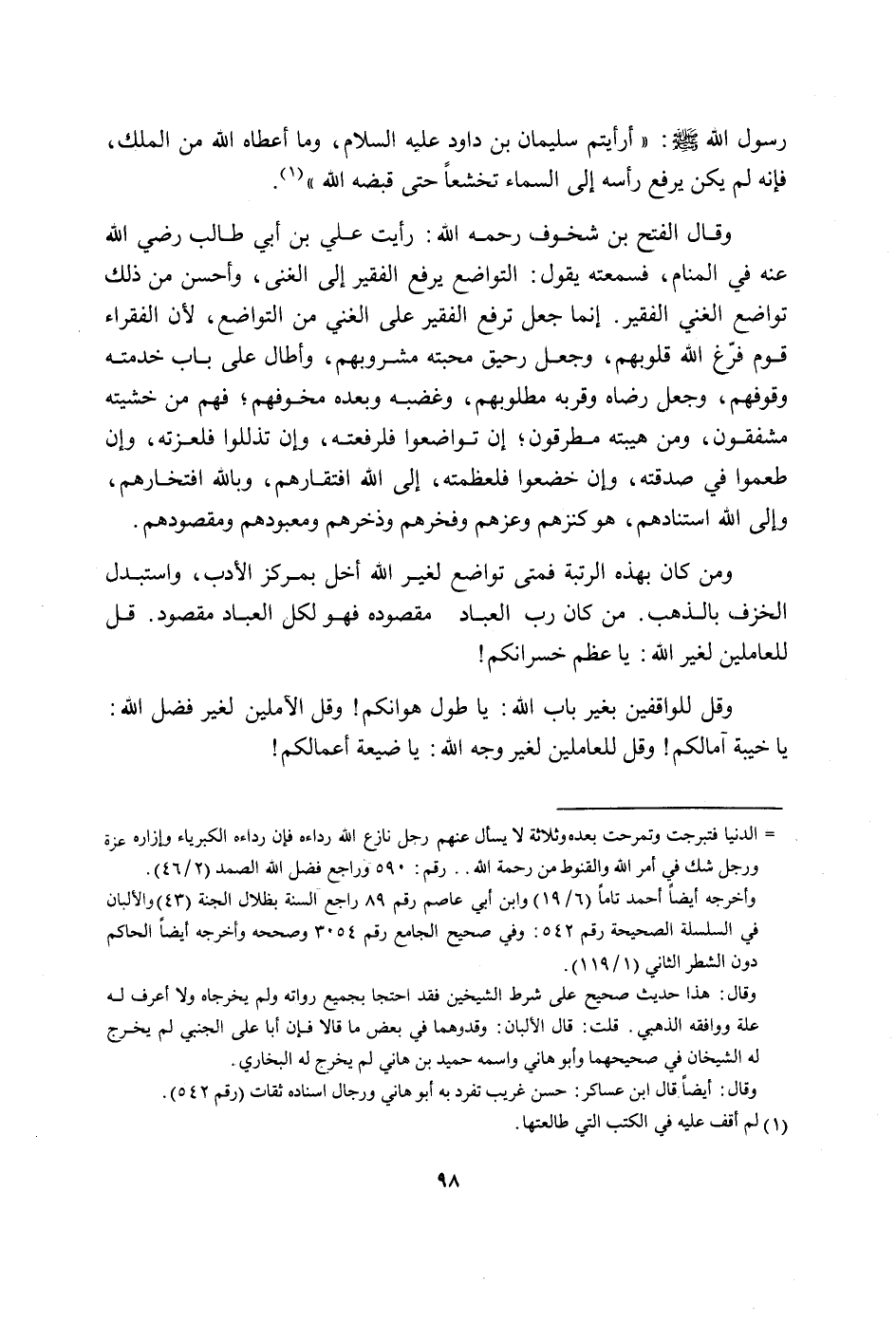 رَسُول الله صلى الله عَلَيْهِ وَسلم أَرَأَيْتُم سُلَيْمَان بن دَاوُد عَلَيْهِ السَّلَام وَمَا أعطَاهُ الله من الْملك فَإِنَّهُ لم يكن يرفع رَأسه إِلَى السَّمَاء تخشعا حَتَّى قَبضه الله وَقَالَ الْفَتْح بن شخوف رَحمَه الله رَأَيْت عَليّ بن أبي طَالب رَضِي الله عَنهُ فِي الْمَنَام فَسَمعته يَقُول التَّوَاضُع يرفع الْفَقِير على الْغنى وَأحسن من ذَلِك تواضع الْغَنِيّ الْفَقِير إِنَّمَا جعل ترفع الْفَقِير على الْغَنِيّ من التَّوَاضُع لِأَن الْفُقَرَاء قوم فرغ الله قُلُوبهم وَجعل رحيق محبته مشروبهم وَأطَال على بَاب خدمته وقوفهم وَجعل رِضَاهُ وقربه مطلوبهم وغضبه وَبعده مخوفهم فهم من خَشيته مشفقون وَمن هيبته مطرقون إِن تواضعوا فلرفعته وَأَن تذللوا فلعزته وَإِن طمعوا فِي صدقته وَإِن خضعوا فلعظمته إِلَى الله افتقارهم وَبِاللَّهِ افتخارهم وَإِلَى الله استنادهم هُوَ كنزهم وعزهم وفخرهم وذخرهم ومعبودهم ومقصودهم وَمن كَانَ بِهَذِهِ الرُّتْبَة فَمَتَى تواضع لغير الله أخل بمركز الْأَدَب واستبدل الخزف بِالذَّهَب من كَانَ رب الْعباد مَقْصُوده فَهُوَ لكل الْعباد مَقْصُود قل للعاملين لغير الله يَا عظم خسرانكم وَقل للواقفين بِغَيْر بَاب الله يَا طول هوانكم وَقل الآملين لغير فضل الله يَا خيبة آمالكم وَقل للعاملين لغير وَجه الله يَا ضَيْعَة أَعمالكُم