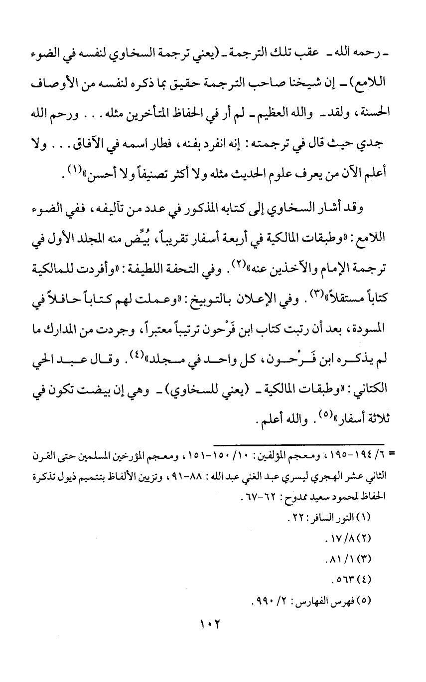 وقد أشار السخاوي إلى كتابه المذكور في عدد من تآليفه، ففي الضوء اللامع: «وطبقات المالكية في أربعة أسفار تقريبا، بيّض منه المجلد الأول في ترجمة الإمام والآخذين عنه» (¬2). وفي التحفة اللطيفة: «وأفردت للمالكية كتابا مستقلا» (¬3). وفي الإعلان بالتوبيخ: «وعملت لهم كتابا حافلا في المسودة، بعد أن رتبت كتاب ابن فرحون ترتيبا معتبرا، وجردت من المدارك ما لم يذكره ابن فرحون، كل واحد في مجلد» (¬4). وقال عبد الحي الكتاني: «وطبقات المالكية - (يعني للسخاوي) - وهي إن بيضت تكون في ثلاثة أسفار» (¬5). والله أعلم.