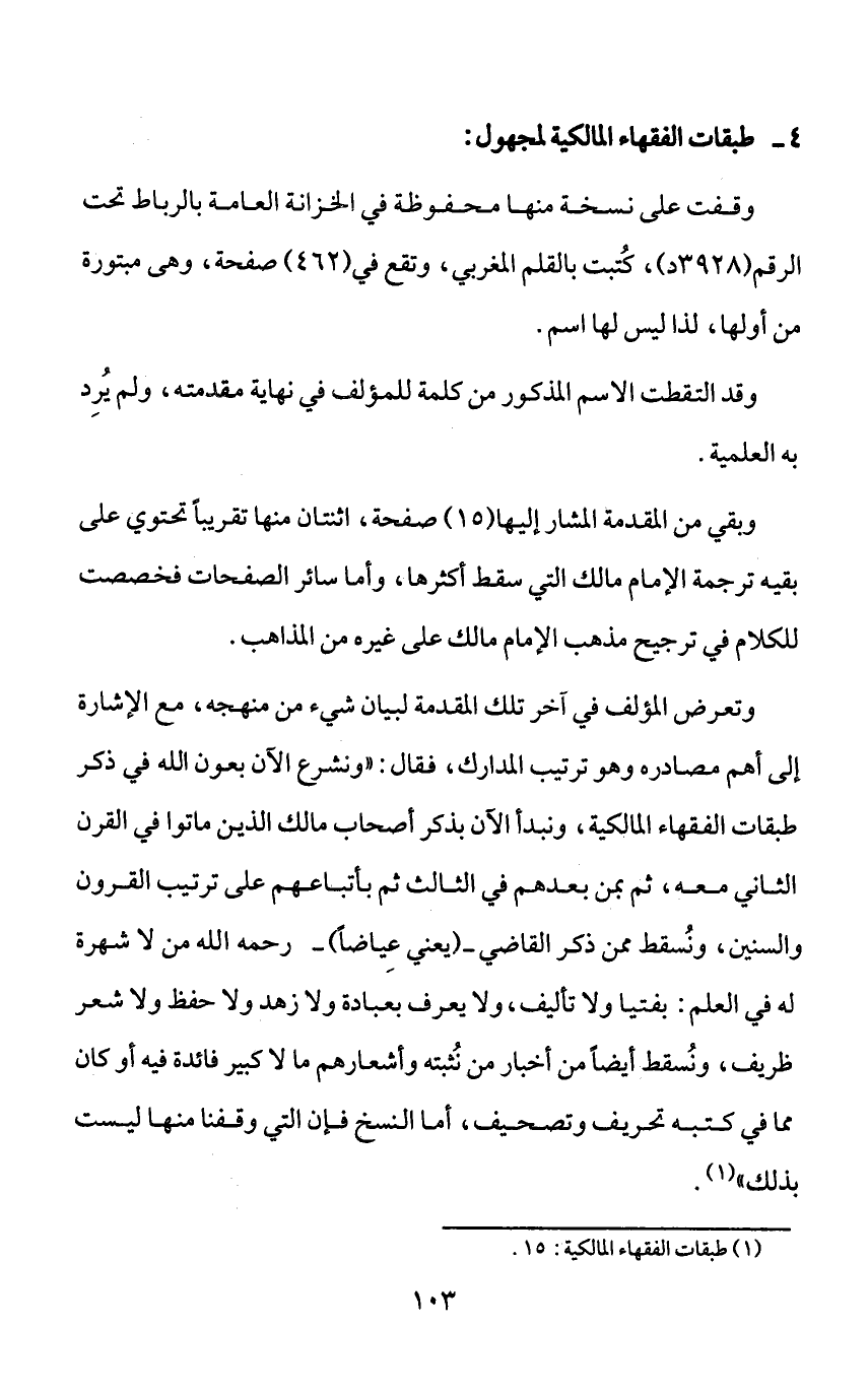 وبقي من المقدمة المشار إليها (15) صفحة، اثنتان منها تقريبا تحتوي على بقية ترجمة الإمام مالك التي سقط أكثرها، وأما سائر الصفحات فخصصت للكلام في ترجيح مذهب الإمام مالك على غيره من المذاهب.
