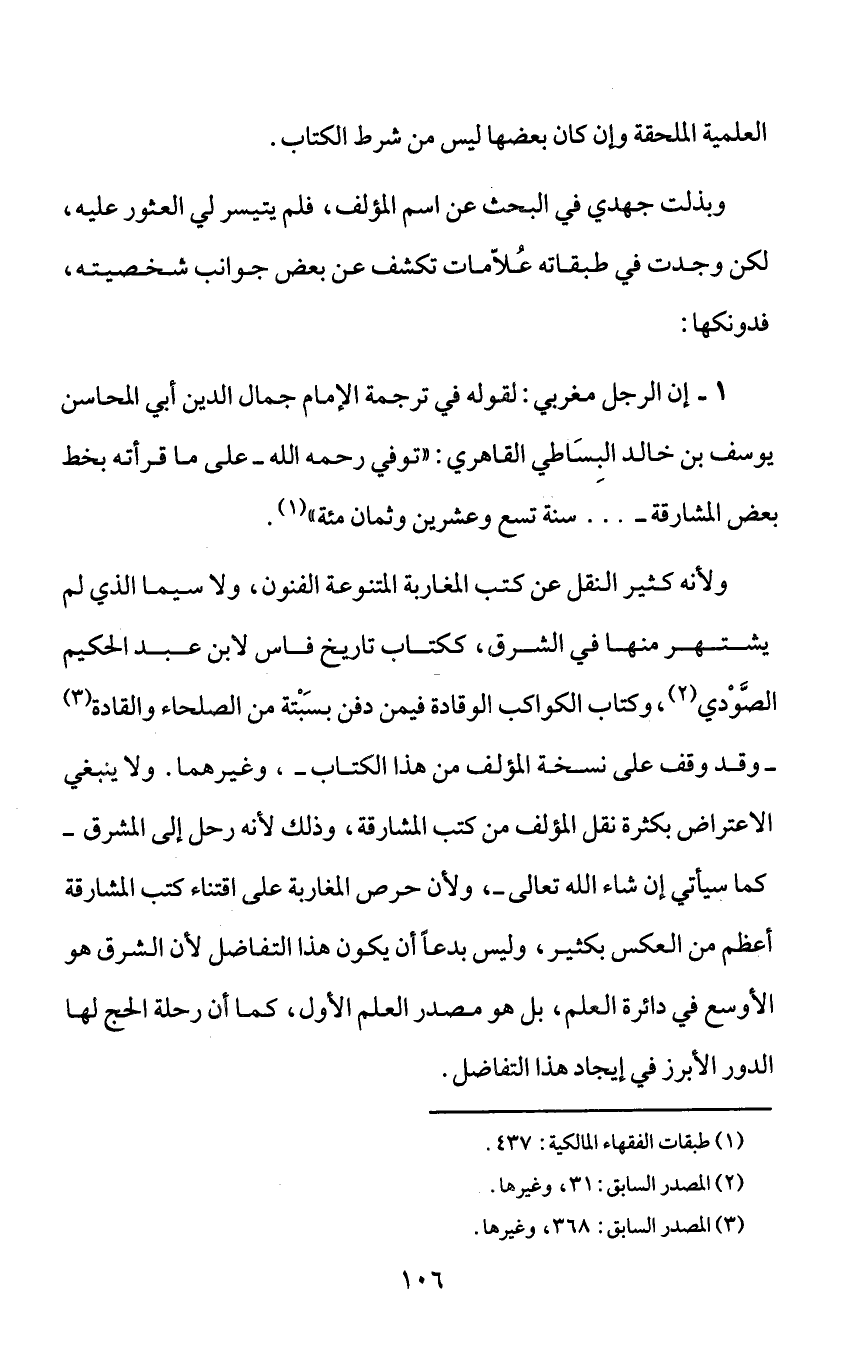 1 - إن الرجل مغربي: لقوله في ترجمة الإمام جمال الدين أبي المحاسن يوسف بن خالد البساطي القاهري: «توفي رحمه الله - على ما قرأته بخط بعض المشارقة -. . . سنة تسع وعشرين وثمان مئة» (¬1).