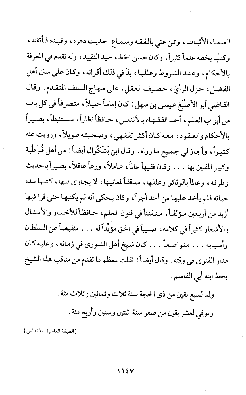 العلماء الأثبات، وممن عني بالفقه وسماع الحديث دهره، وقيده فأتقنه، وكتب بخطه علما كثيرا، وكان حسن الخط، جيد التقييد، وله تقدم في المعرفة بالأحكام، وعقد الشروط وعللها، بذّ في ذلك أقرانه، وكان على سنن أهل الفضل، جزل الرأي، حصيف العقل، على منهاج السلف المتقدم. وقال القاضي أبو الأصبغ عيسى بن سهل: كان إماما جليلا، متصرفا في كل باب من أبواب العلم، أحد الفقهاء بالأندلس، حافظا نظارا، مستنبطا، بصيرا بالأحكام والعقود، معه كان أكثر تفقهي، وصحبته طويلا، ورويت عنه كثيرا، وأجاز لي جميع ما رواه. وقال ابن بشكوال أيضا: من أهل قرطبة وكبير المفتين بها. . . وكان فقيها عالما، عاملا، ورعا عاقلا، بصيرا بالحديث وطرقه، وعالما بالوثائق وعللها، مدققا لمعانيها، لا يجارى فيها، كتبها مدة حياته فلم يأخذ عليها من أحد أجرا، وكان يحكى أنه لم يكتبها حتى قرأ فيها أزيد من أربعين مؤلفا، متفننا في فنون العلم، حافظا للأخبار والأمثال والأشعار كثيرا في كلامه، صليبا في الحق مؤيّدا له. . . منقبضا عن السلطان وأسبابه. . . متواضعا. . . كان شيخ أهل الشورى في زمانه، وعليه كان مدار الفتوى في وقته. وقال أيضا: نقلت معظم ما تقدم من مناقب هذا الشيخ بخط ابنه أبي القاسم.