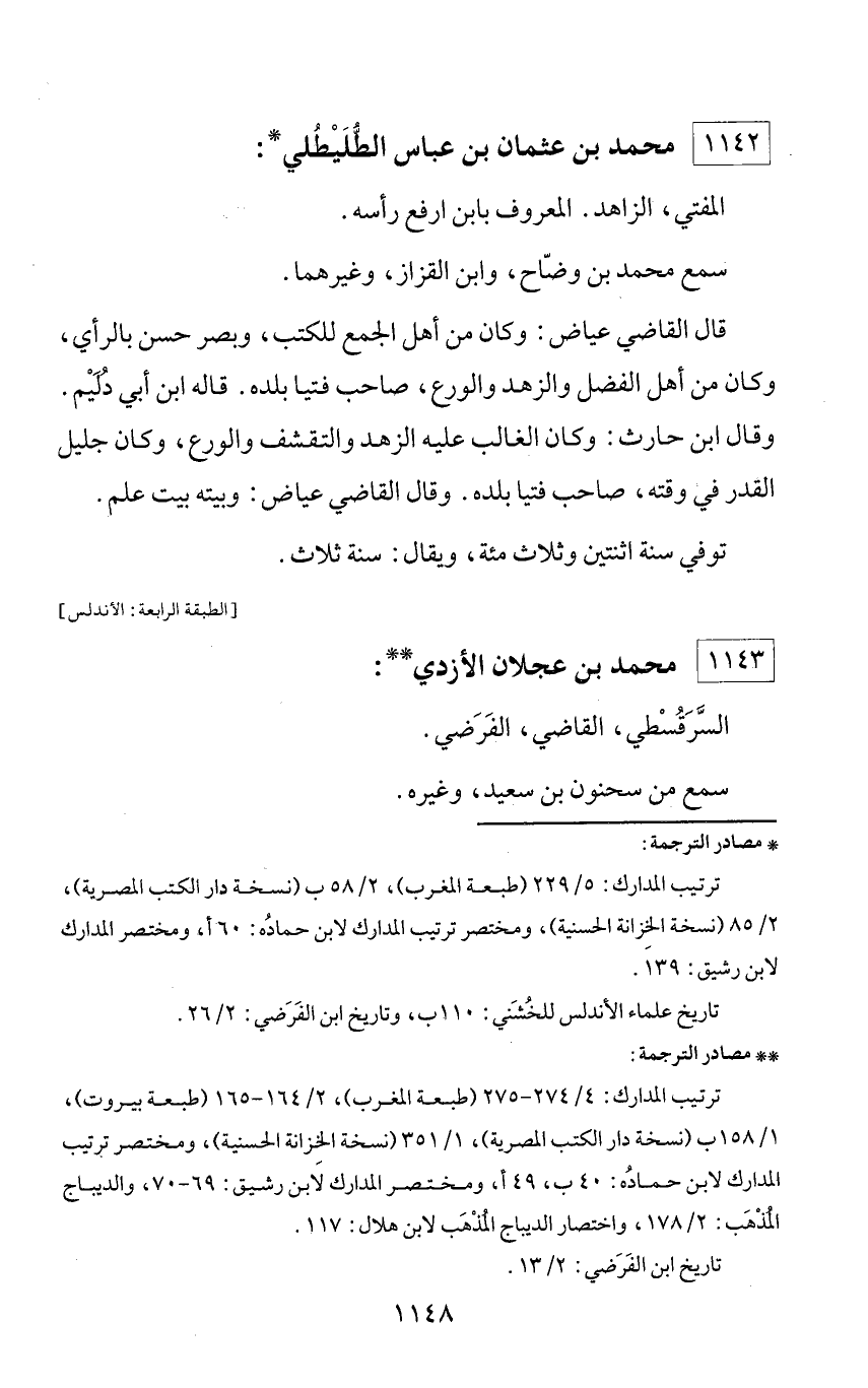 ** مصادر الترجمة: ترتيب المدارك: 4/ 274 - 275 (طبعة المغرب)، 2/ 164 - 165 (طبعة بيروت)، 1/ 158 ب (نسخة دار الكتب المصرية)، 1/ 351 (نسخة الخزانة الحسنية)، ومختصر ترتيب المدارك لابن حماده: 40 ب، 49 أ، ومختصر المدارك لابن رشيق: 69 - 70، والديباج المذهب: 2/ 178، واختصار الديباج المذهب لابن هلال: 117. تاريخ ابن الفرضي: 2/ 13.