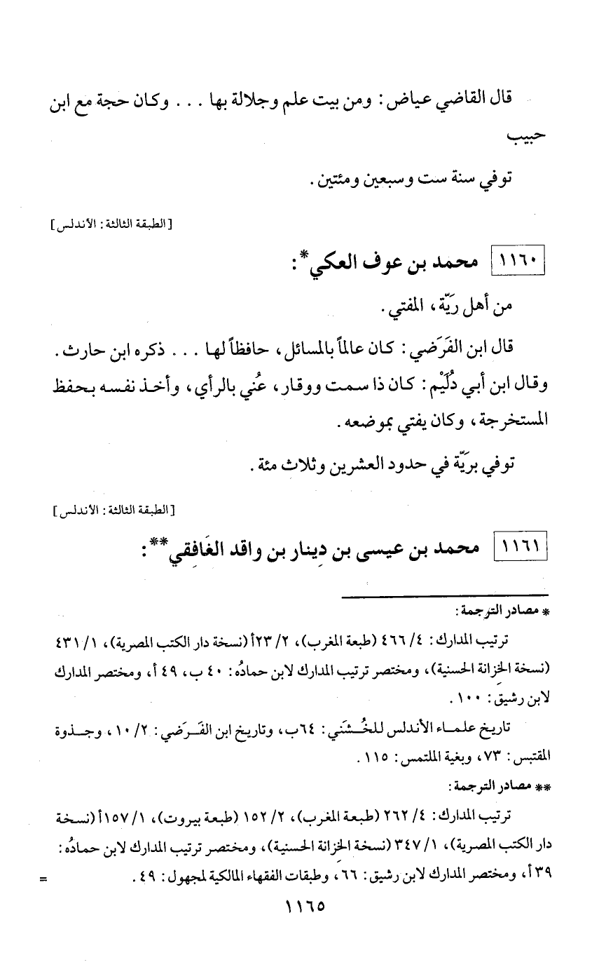 ** مصادر الترجمة: ترتيب المدارك: 4/ 262 (طبعة المغرب)، 2/ 152 (طبعة بيروت)، 1/ 157 أ (نسخة دار الكتب المصرية)، 1/ 347 (نسخة الخزانة الحسنية)، ومختصر ترتيب المدارك لابن حماده: 39 أ، ومختصر المدارك لابن رشيق: 66، وطبقات الفقهاء المالكية لمجهول: 49. =