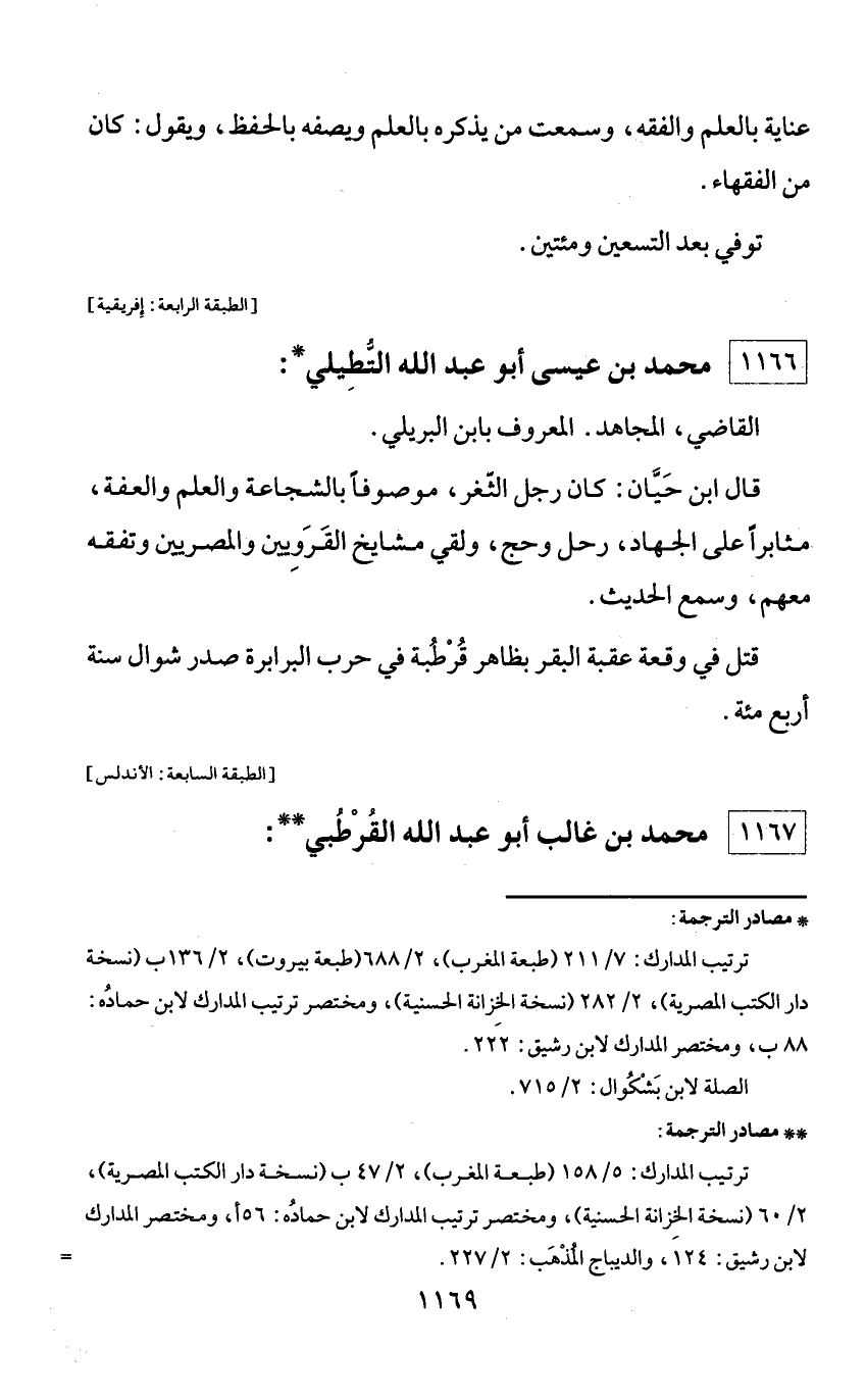 * مصادر الترجمة: ترتيب المدارك: 7/ 211 (طبعة المغرب)، 2/ 688 (طبعة بيروت)، 2/ 136 ب (نسخة دار الكتب المصرية)، 2/ 282 (نسخة الخزانة الحسنية)، ومختصر ترتيب المدارك لابن حماده: 88 ب، ومختصر المدارك لابن رشيق: 222. الصلة لابن بشكوال: 2/ 715.