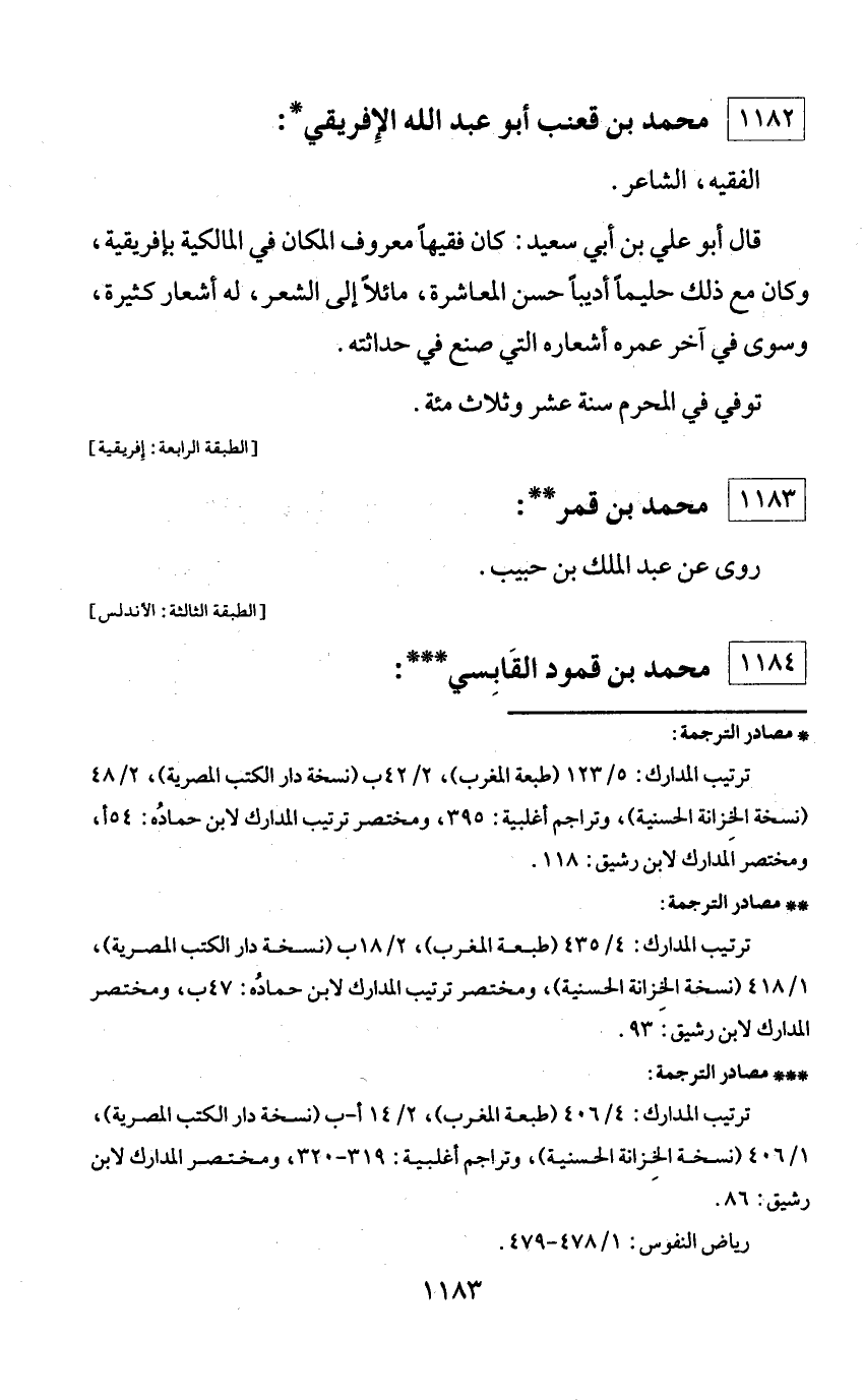 ... مصادر الترجمة: ترتيب المدارك: 4/ 406 (طبعة المغرب)، 2/ 14 أ - ب (نسخة دار الكتب المصرية)، 1/ 406 (نسخة الخزانة الحسنية)، وتراجم أغلبية: 319 - 320، ومختصر المدارك لابن رشيق: 86. رياض النفوس: 1/ 478 - 479.