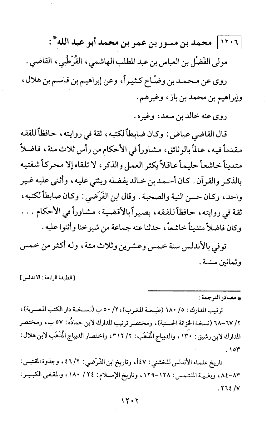 * مصادر الترجمة: ترتيب المدارك: 5/ 180 (طبعة المغرب)، 2/ 50 ب (نسخة دار الكتب المصرية)، 2/ 67 - 68 (نسخة الخزانة الحسنية)، ومختصر ترتيب المدارك لابن حماده: 57 ب، ومختصر المدارك لابن رشيق: 130، والديباج المذهب: 2/ 312، واختصار الديباج المذهب لابن هلال: 153. تاريخ علماء الأندلس للخشني: 47 أ، وتاريخ ابن الفرضي: 2/ 46، وجذوة المقتبس: 83 - 84، وبغية الملتمس: 128 - 129، وتاريخ الإسلام: 24/ 180، والمقفى الكبير: 7/ 264.