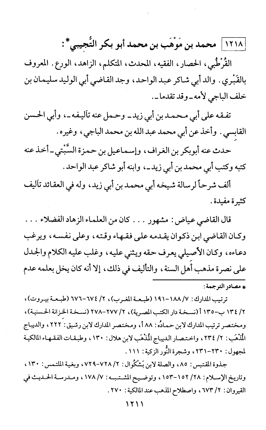 * مصادر الترجمة: ترتيب المدارك: 7/ 188 - 191 (طبعة المغرب)، 2/ 674 - 676 (طبعة بيروت)، 2/ 134 ب - 135 أ (نسخة دار الكتب المصرية)، 2/ 277 - 278 (نسخة الخزانة الحسنية)، ومختصر ترتيب المدارك لابن حماده: 88 أ، ومختصر المدارك لابن رشيق: 222، والديباج المذهب: 2/ 234، واختصار الديباج المذهب لابن هلال: 130، وطبقات الفقهاء المالكية لمجهول: 230 - 231، وشجرة النّور الزكية: 111. جذوة المقتبس: 85، والصلة لابن بشكوال: 2/ 728 - 729، وبغية الملتمس: 130، وتاريخ الإسلام: 28/ 152 - 153، وتوضيح المشتبه: 7/ 178، ومدرسة الحديث في القيروان: 2/ 673، واصطلاح المذهب عند المالكية: 270.