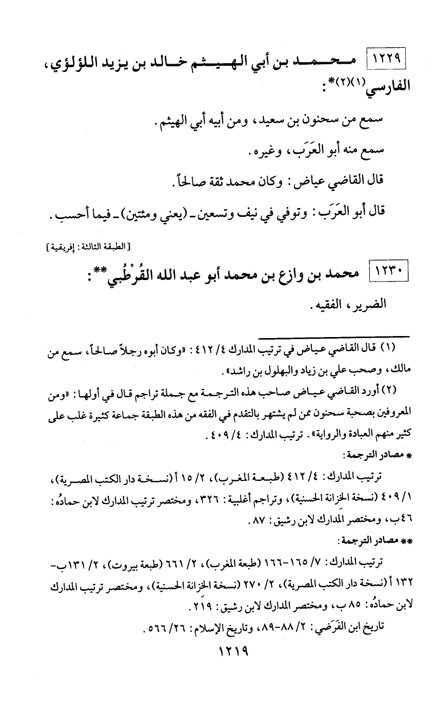 ** مصادر الترجمة: ترتيب المدارك: 7/ 165 - 166 (طبعة المغرب)، 2/ 661 (طبعة بيروت)، 2/ 131 ب - 132 أ (نسخة دار الكتب المصرية)، 2/ 270 (نسخة الخزانة الحسنية)، ومختصر ترتيب المدارك لابن حماده: 85 ب، ومختصر المدارك لابن رشيق: 219. تاريخ ابن الفرضي: 2/ 88 - 89، وتاريخ الإسلام: 26/ 566.