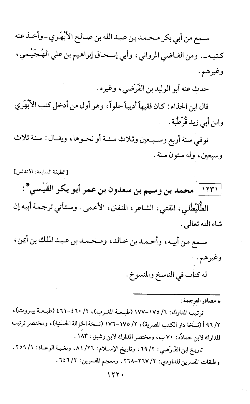 * مصادر الترجمة: ترتيب المدارك: 6/ 175 - 177 (طبعة المغرب)، 2/ 460 - 461 (طبعة بيروت)، 2/ 96 أ (نسخة دار الكتب المصرية)، 2/ 175 - 176 (نسخة الخزانة الحسنية)، ومختصر ترتيب المدارك لابن حماده: 70 ب، ومختصر المدارك لابن رشيق: 183. تاريخ ابن الفرضي: 2/ 69، وتاريخ الإسلام: 26/ 81، وبغية الوعاة: 1/ 259، وطبقات المفسرين للداودي: 2/ 267 - 268، ومعجم المفسرين: 2/ 646.